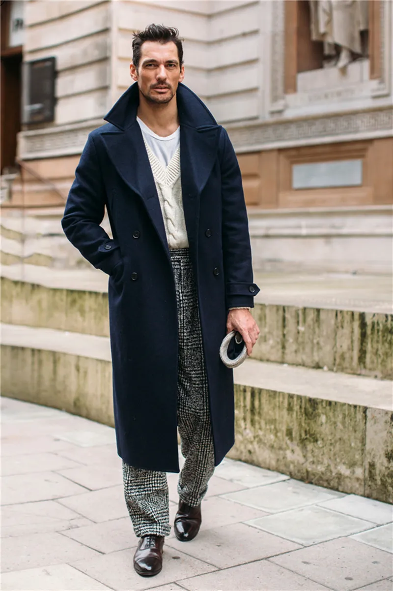 Men's Woolen Good Quality Coat Navy Blue Winter Warm Solid Double-Breasted Thick Plus V-Neck Overcoat Casual Male Overcoat