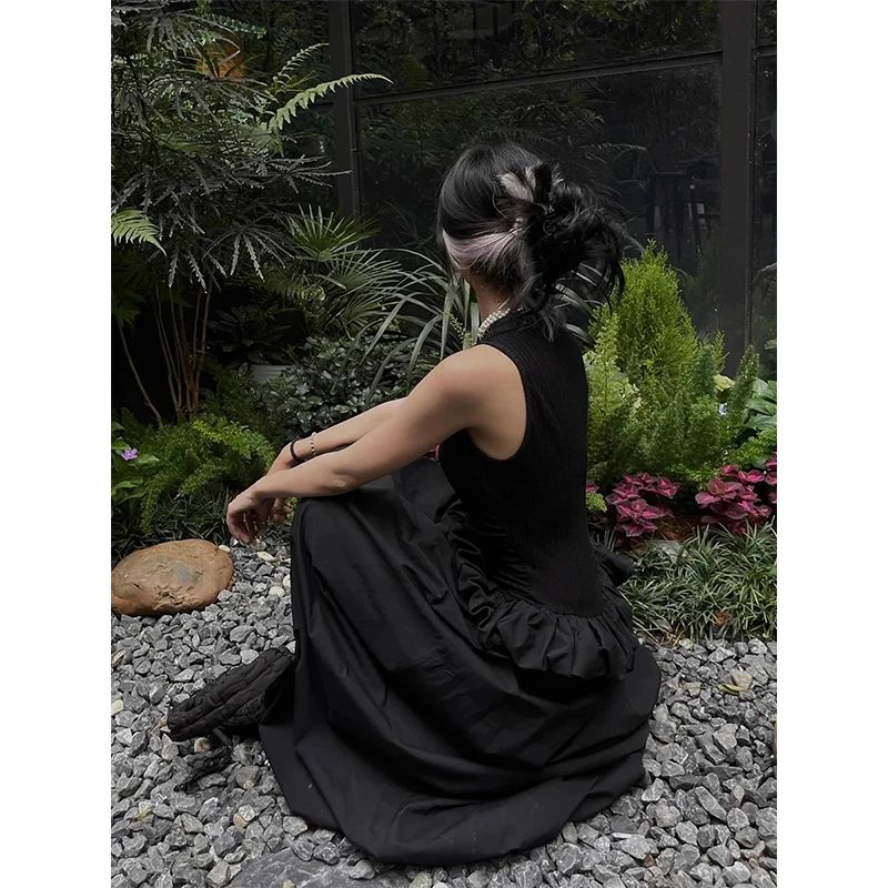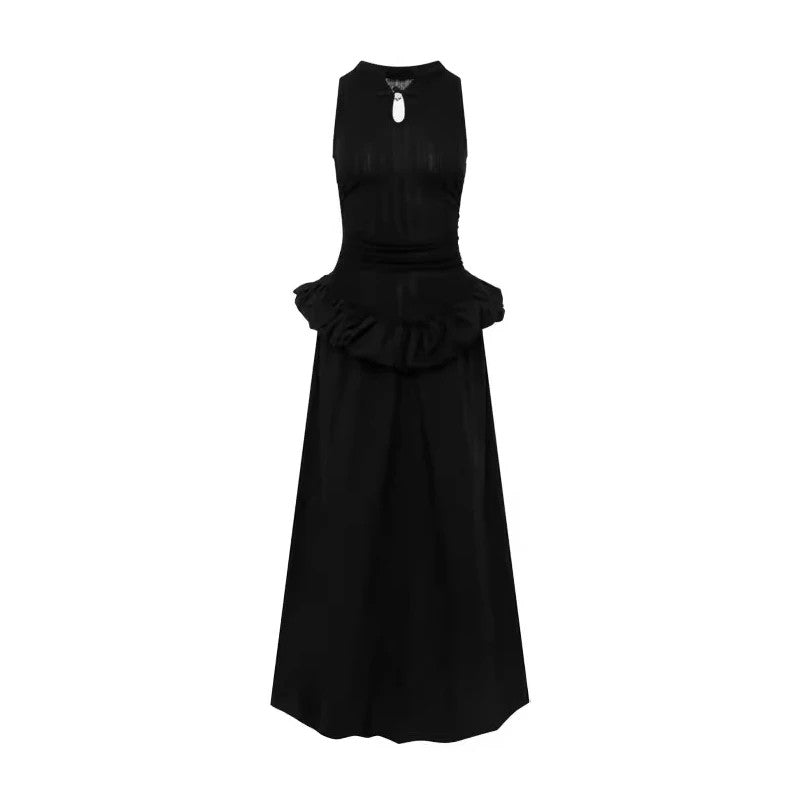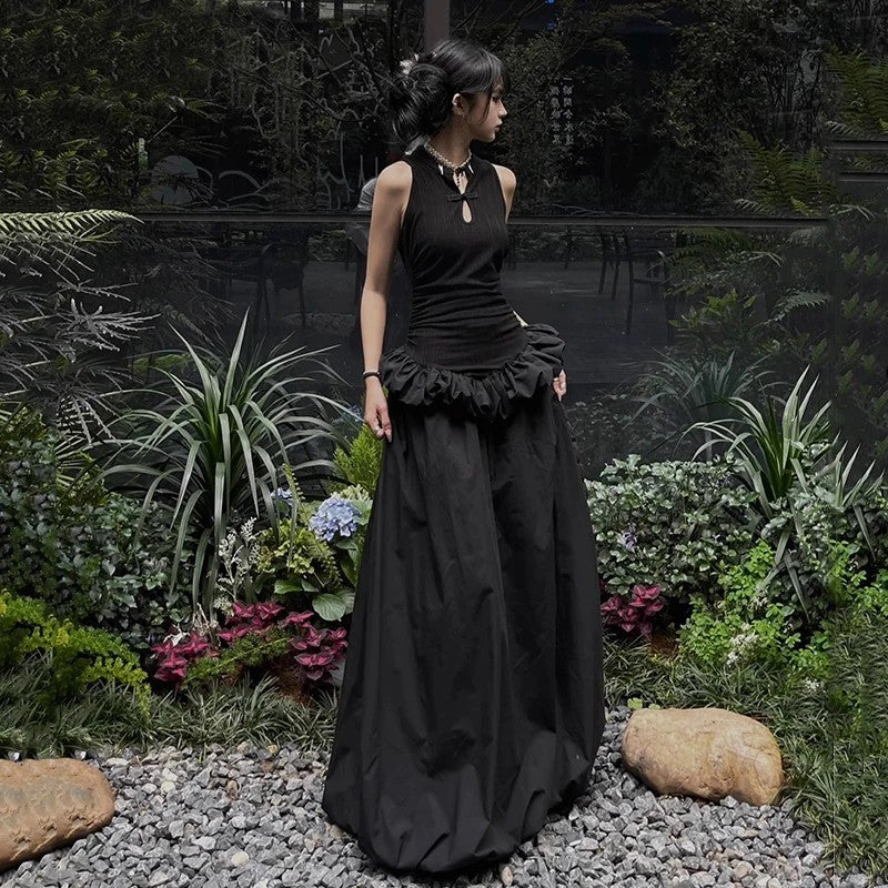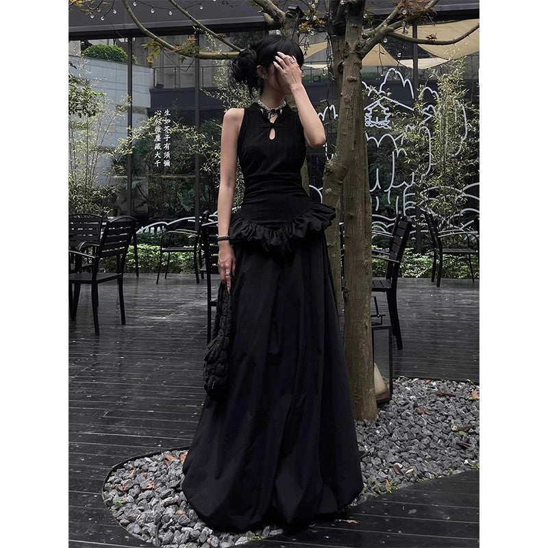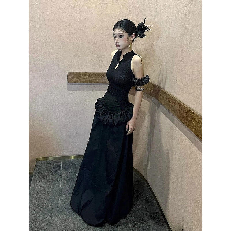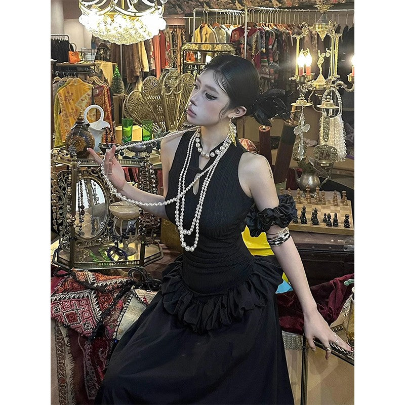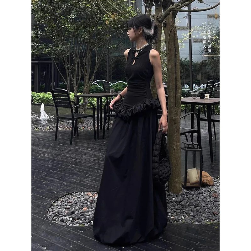 MEXZT Vintage Black Long Dress Women Party Prom Ruffles Sleeveless Maxi Dresses