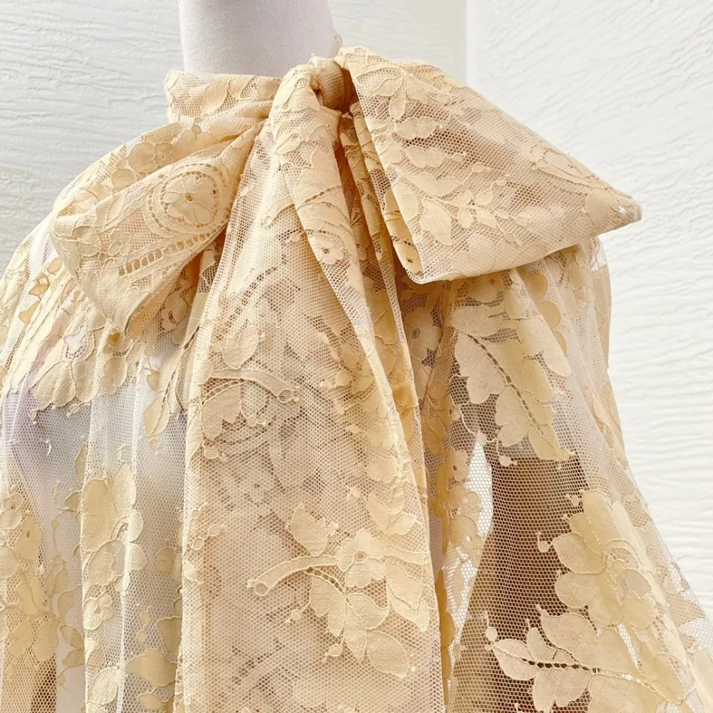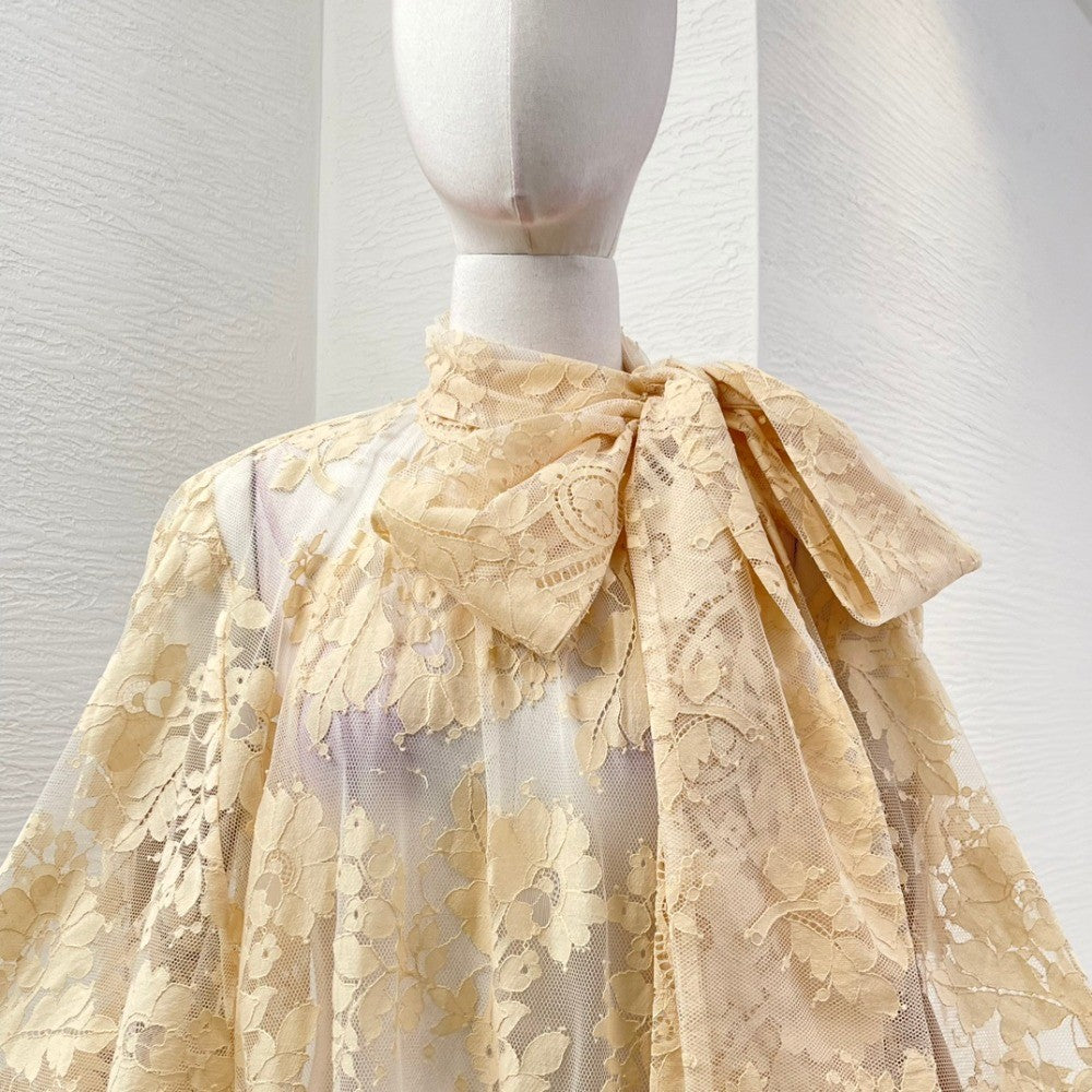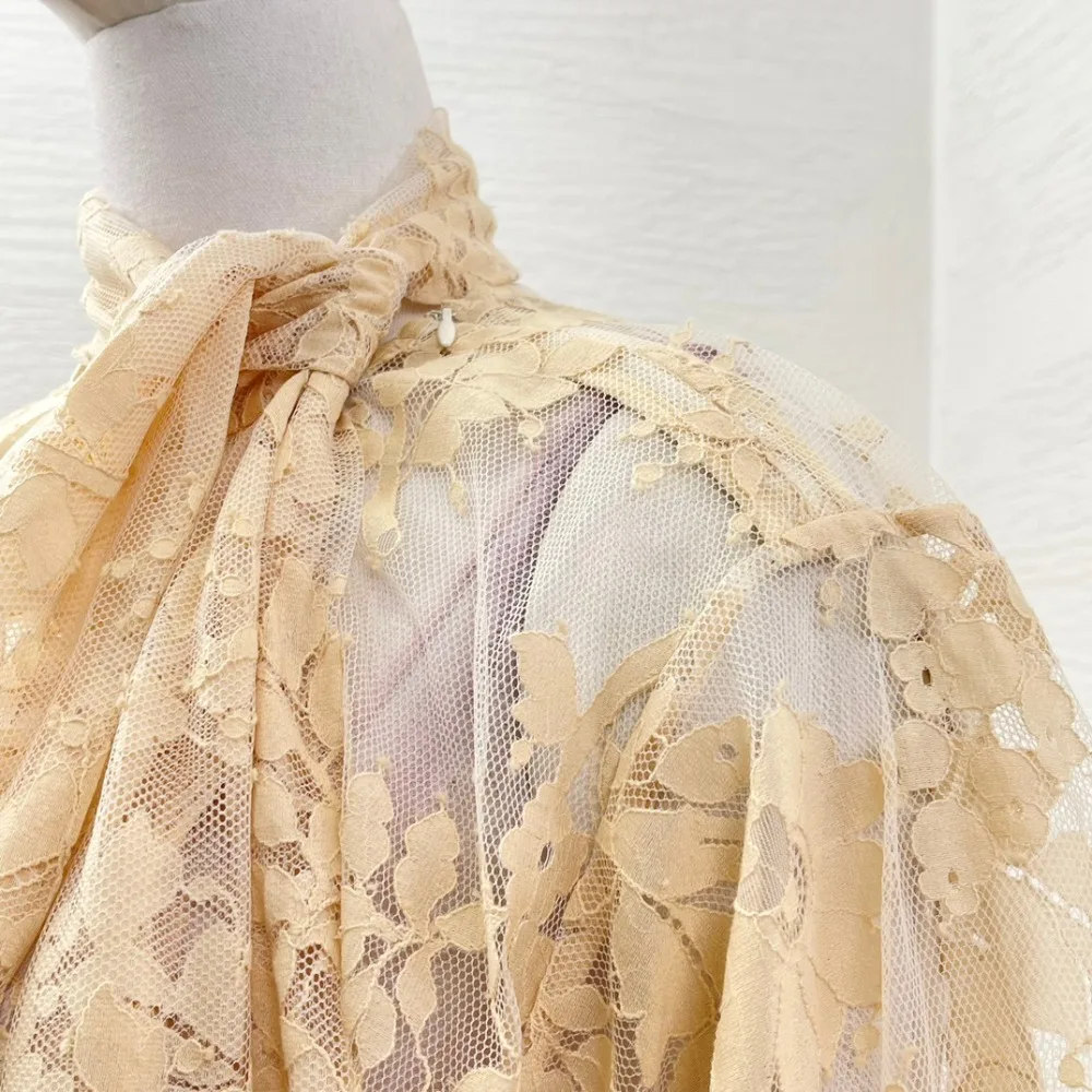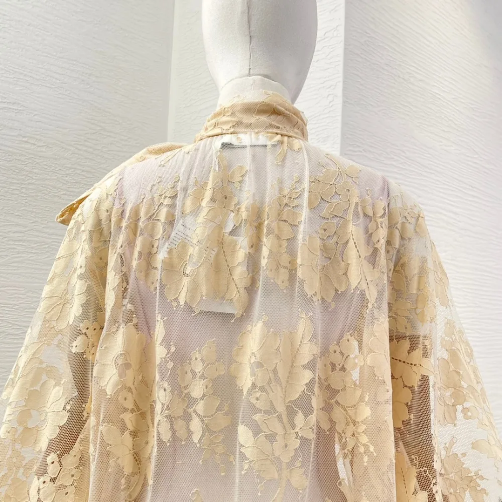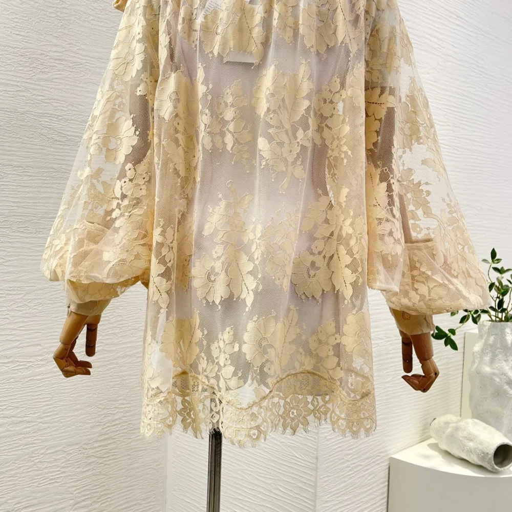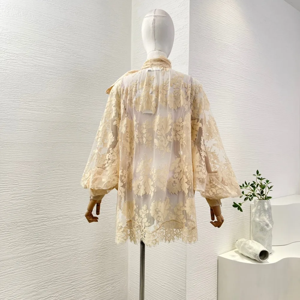 Milk Tea Color Long Sleeve Lace See Through Blouse Tops 2025 New Design