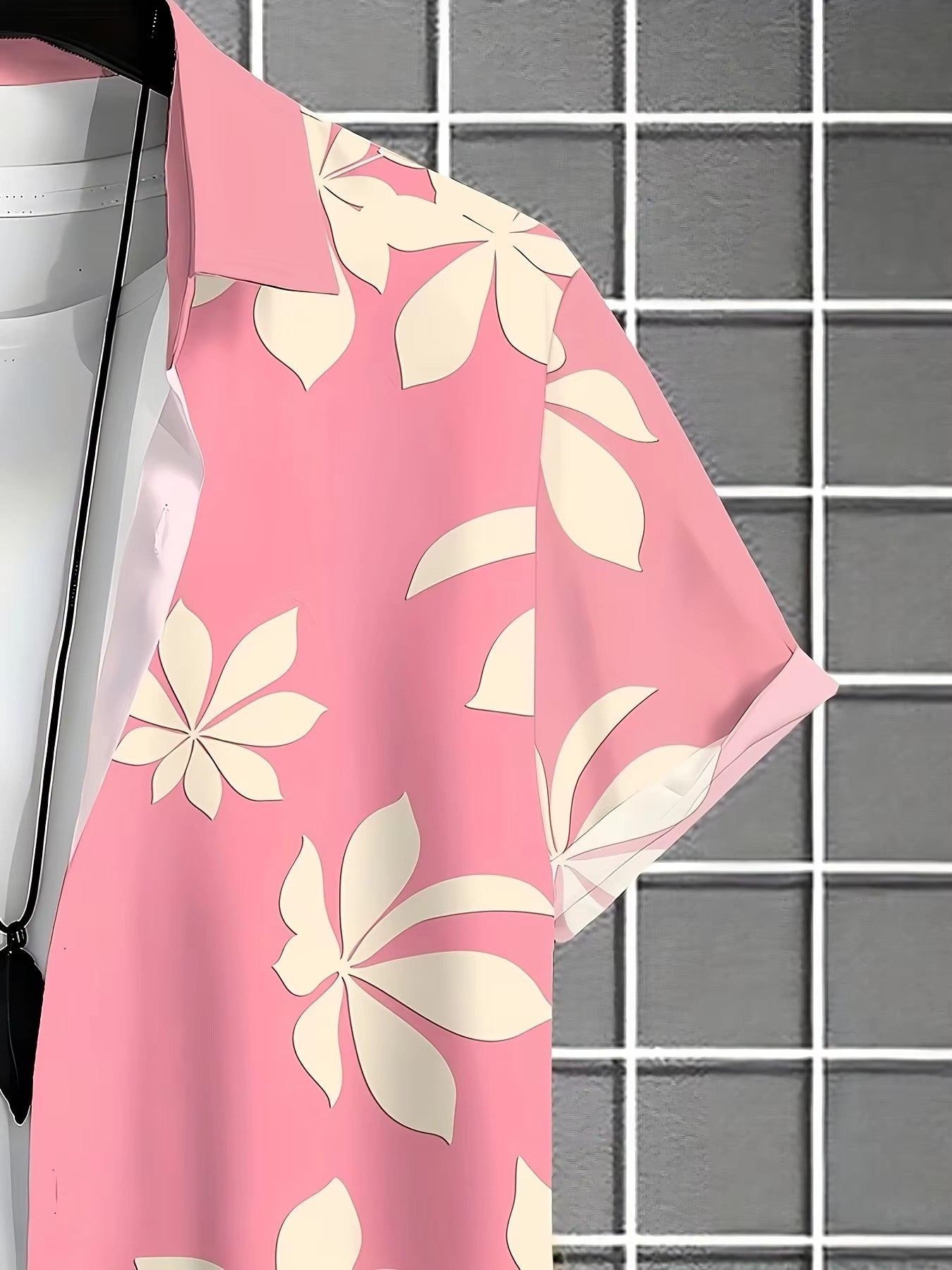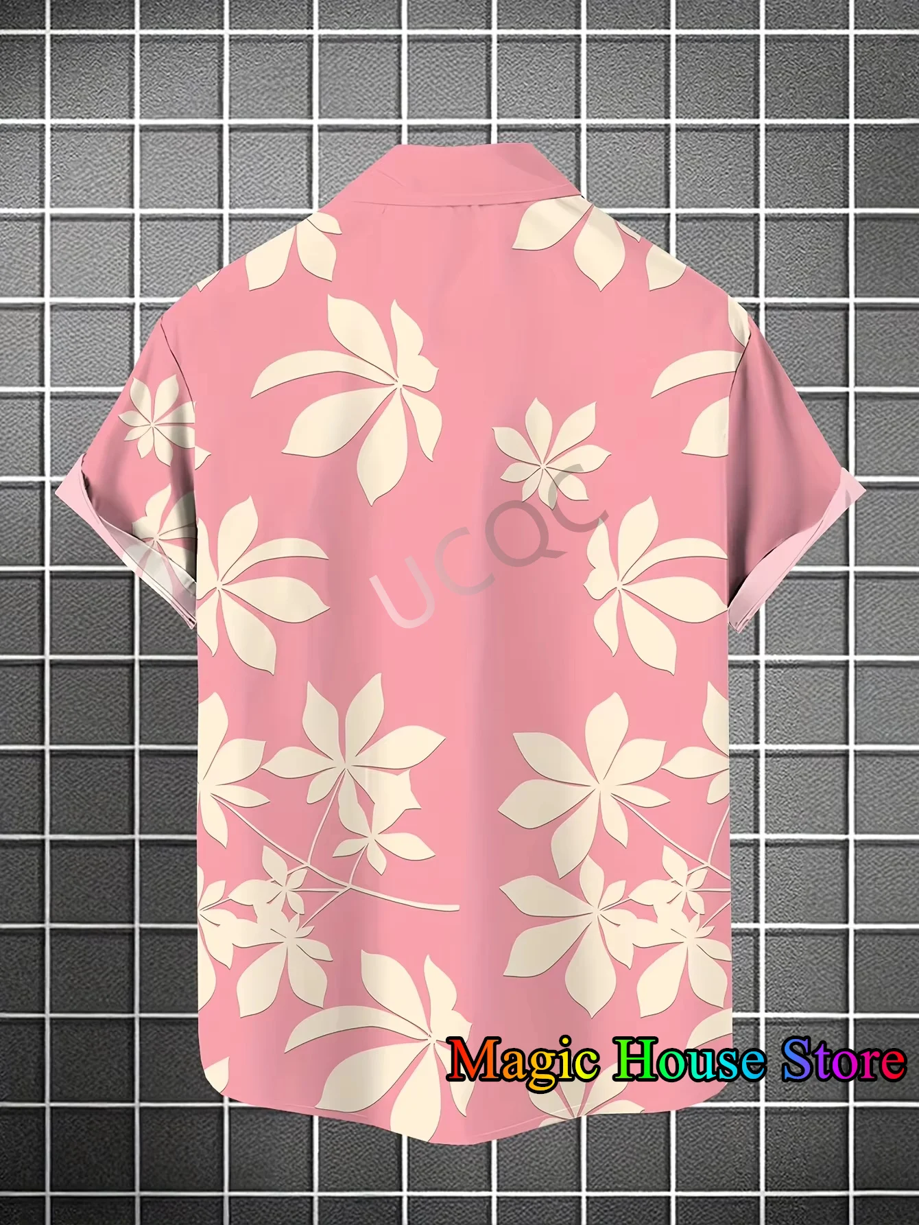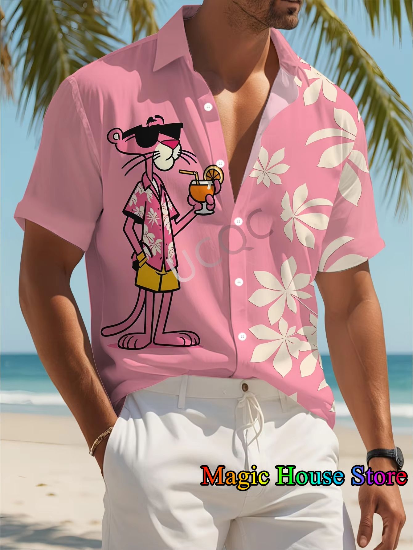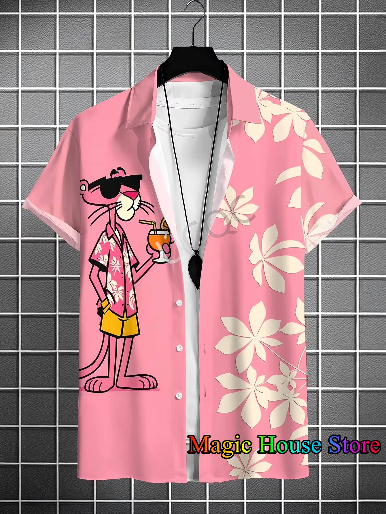 MINISO New Men's Lapel Short Sleeve Hawaiian Shirt Summer Pink Panther Print Hawaii Vacation Casual Fashion Kids/Adult ?Tops