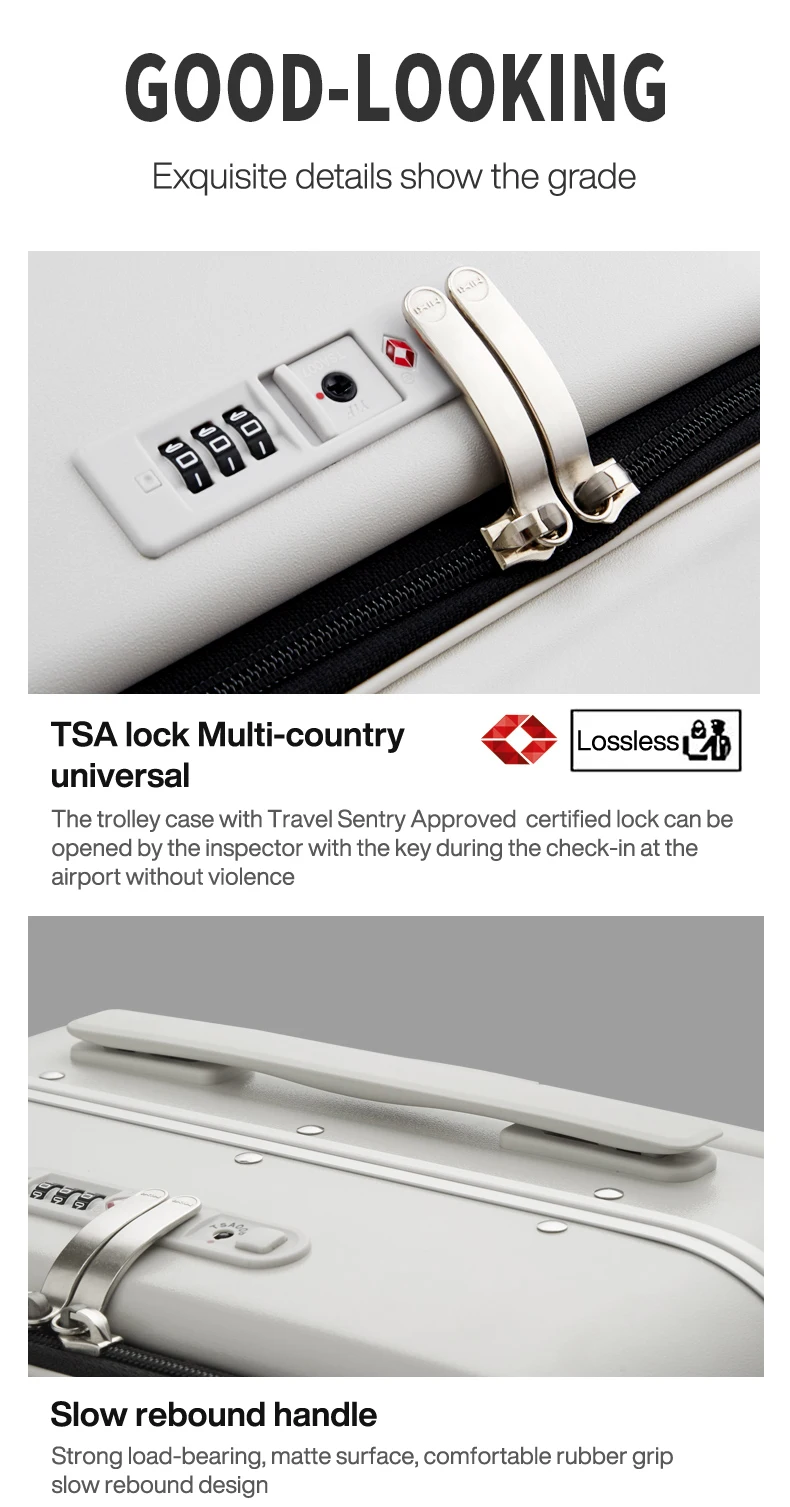 1. The 3rd generation Aluminum frame combined with Top quality PC material, the suitcase is high quality, elegant and durable;