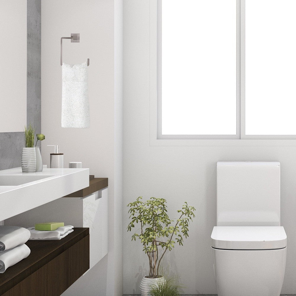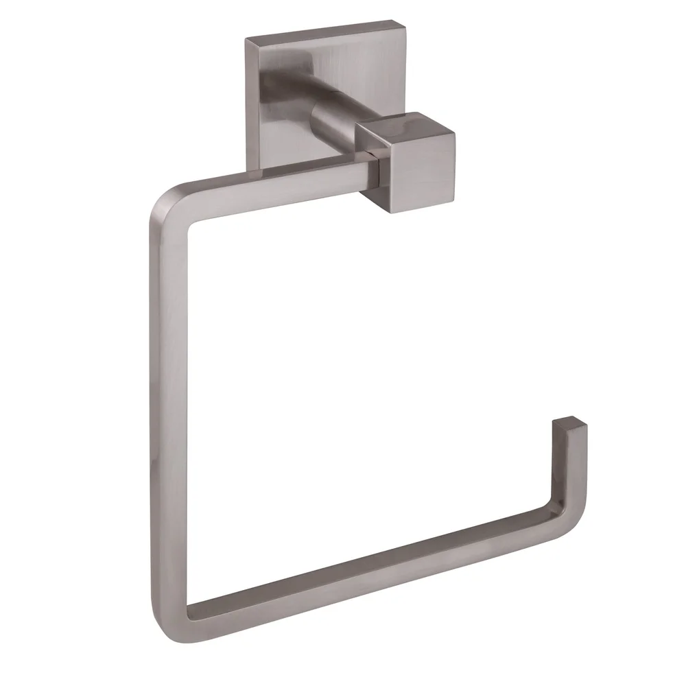 The Karsen Towel Ring is a contemporary addition to any bathroom. This modern towel ring has a square design and is finished in satin nickel. This ring has a sturdy design for hanging medium to larger sized towels. Mount on a door or along a wall. Concealed screws give this fixture a finished look. Use the provided template for quick and simple installation. The Karsen Collection features matching towel bars, a toilet paper holder and robe hook.