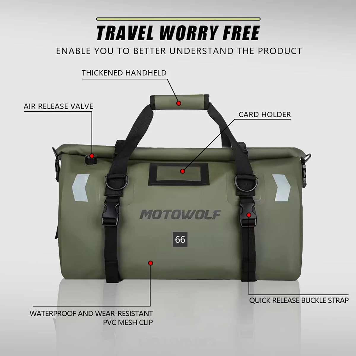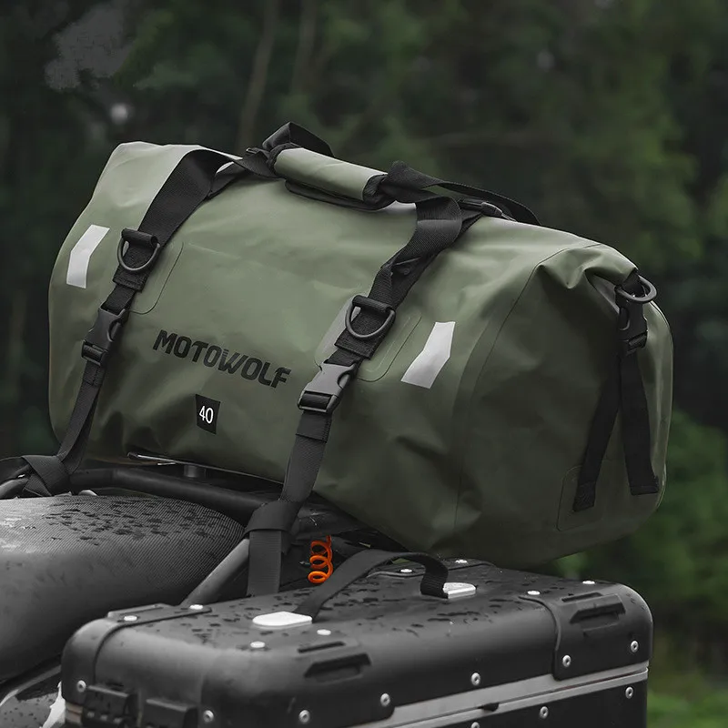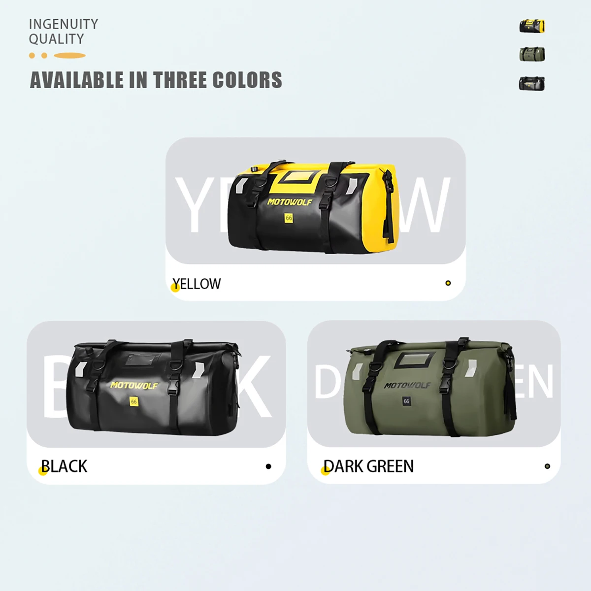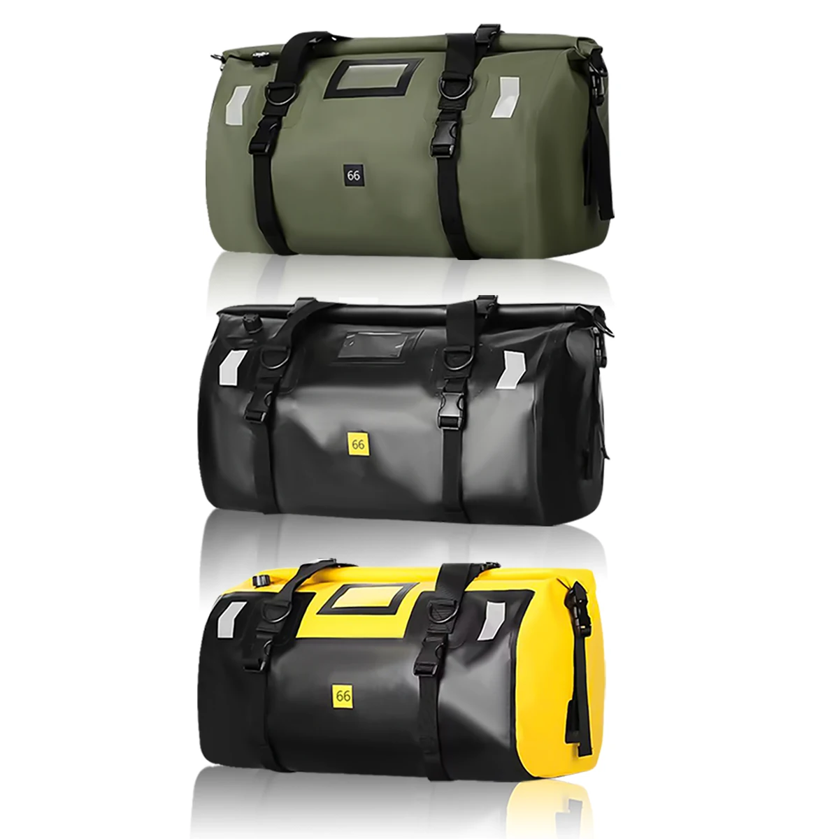 Large Capacity: 40L and 66L are available for your options.The roll-top closure provides ample space in the bag, perfect for storing motorcycle repair tools, everyday items, and more.