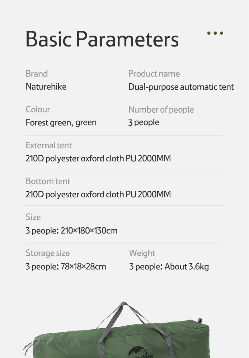 Naturehike Camping Automatic Tent One Touch Waterproof Roof Top Tents Double Door 3 Person Tent Outdoor Beach Fish Shelter Tent