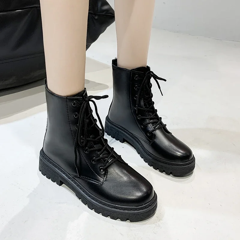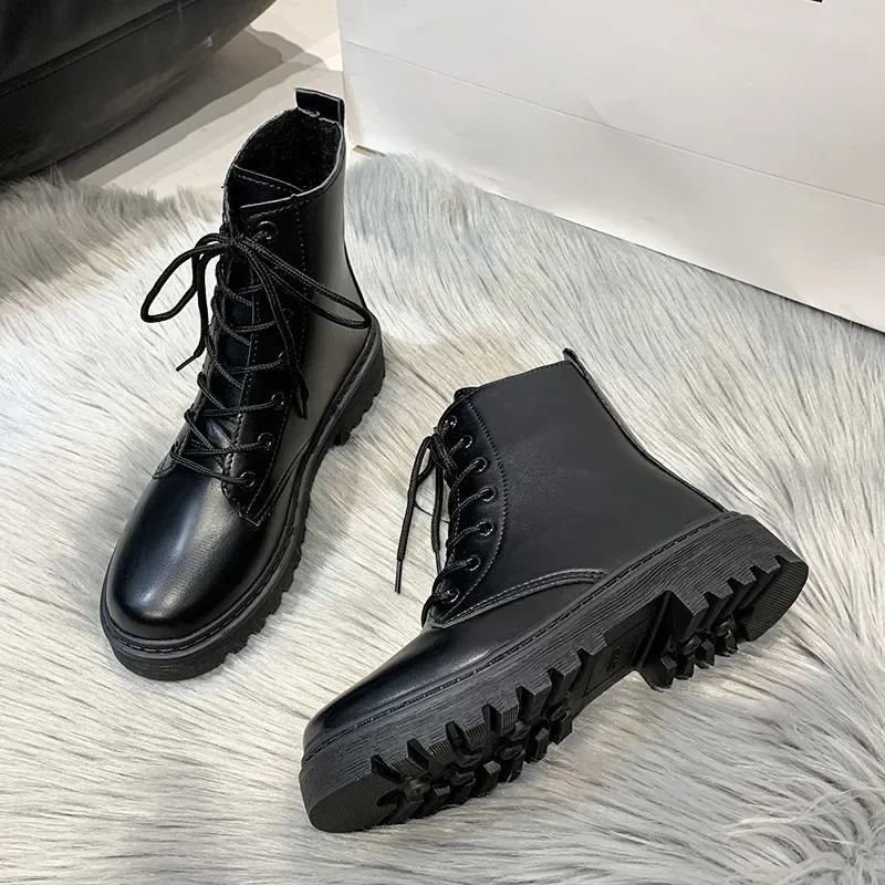 New Autumn Flat-soled Retro Lace-up Short-tube Solid Color Round-toe Korean Style Fashion Boots Sports Thick-soled Riding Boots