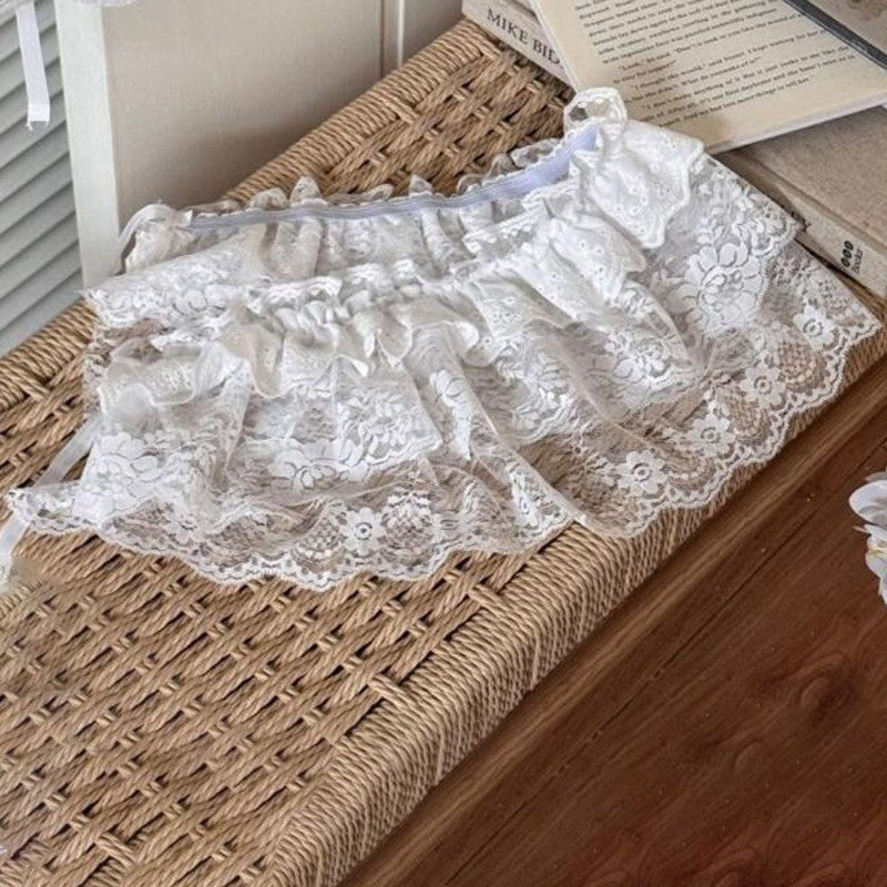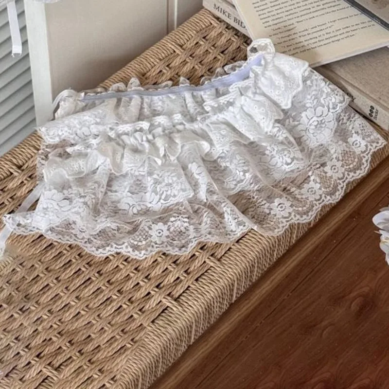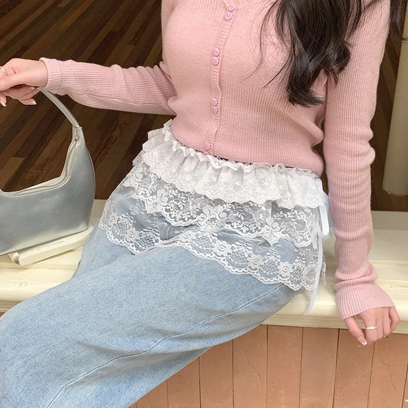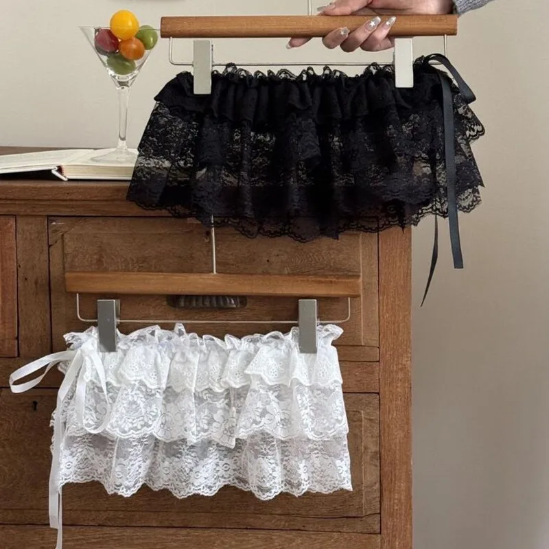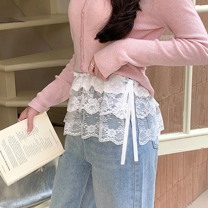 New Embroidered Flower Lace Mini Skirt See Through Y2K Streetwear Ruched Skirts Harajuku Butt Curtain Jeans Decoration