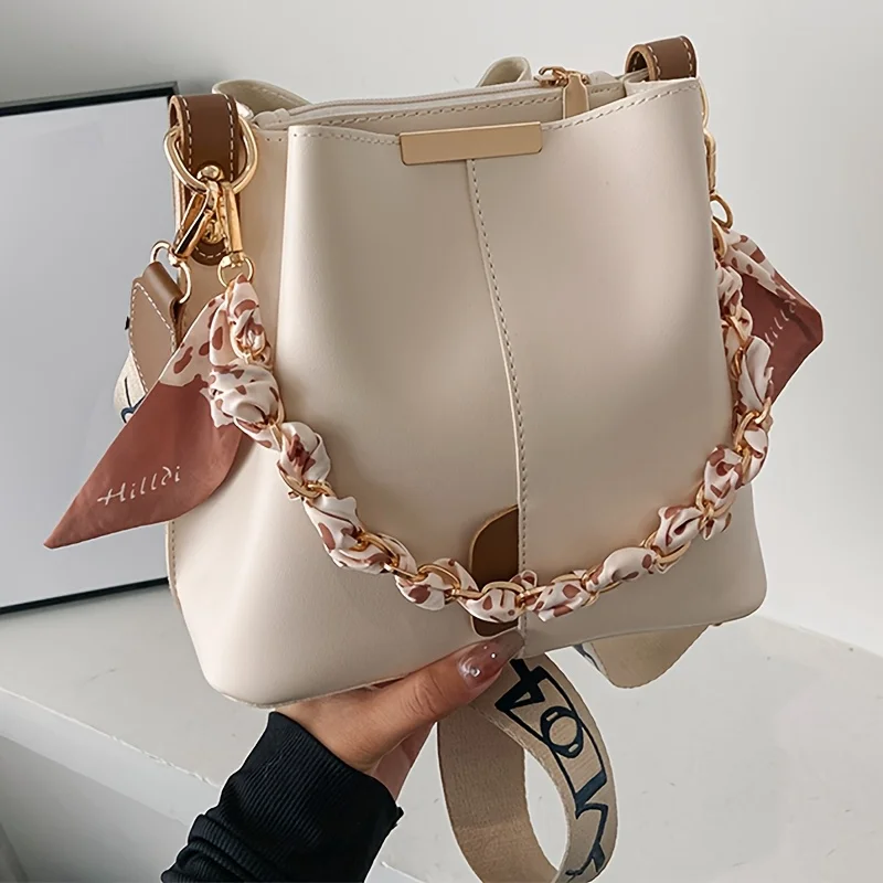 Luxurious Chain & Scarf Strap: The bag features a unique chain strap intertwined with a delicate scarf. The gold - toned chain adds a touch of luxury, while the scarf brings a soft and feminine element. The adjustable shoulder strap also allows for cross - body or shoulder carrying, adapting to your comfort and style preferences.