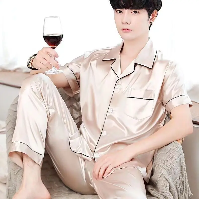 New Ice Silk Pajamas, Men's Summer Short-Sleeved Trousers, Thin High-End Simulated Silk Plus-Size Loose Loungewear Two-Piece Set