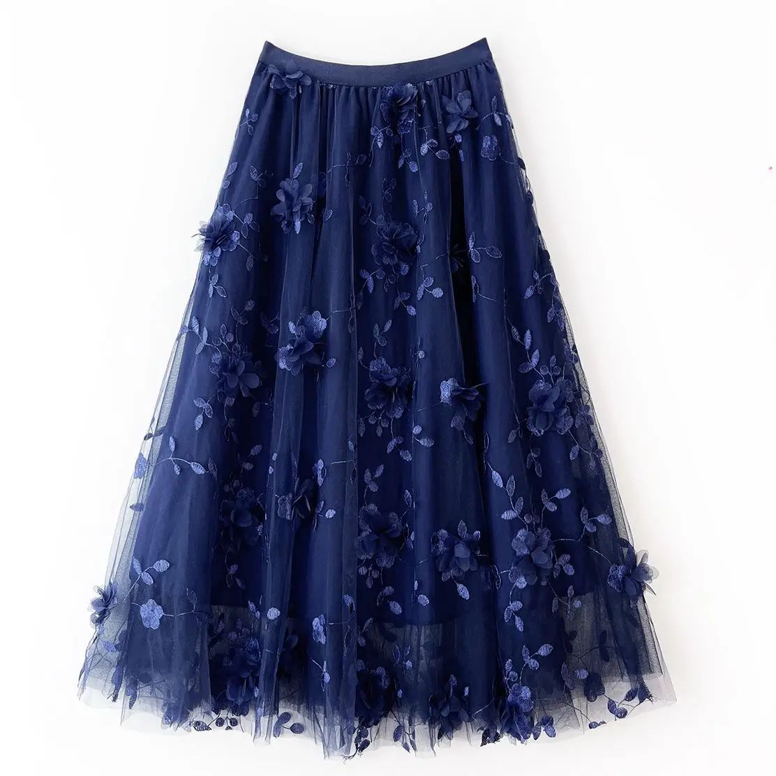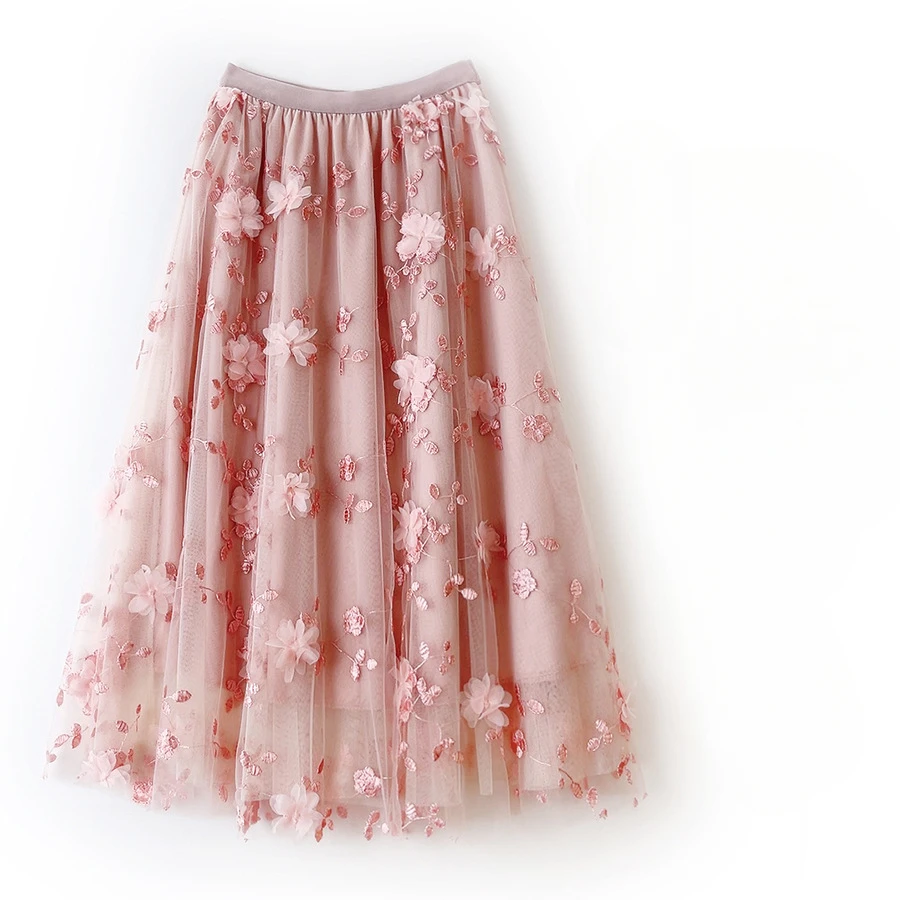 New in A-Line High Waist Embroidery 3D Flower Tulle Midi Skirt Women Spring Summer Pink Chic Elegant Mesh Party Long Skirt