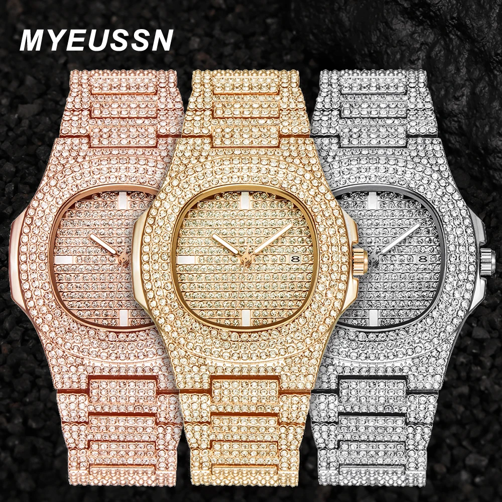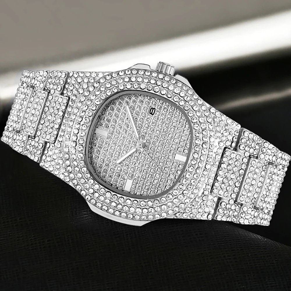 New Punk Men Watch Iced Out Diamond Sparkling Quartz Watches Fashion Hip Hop Classic Silver Color Watch Jewelry Men Women Gift