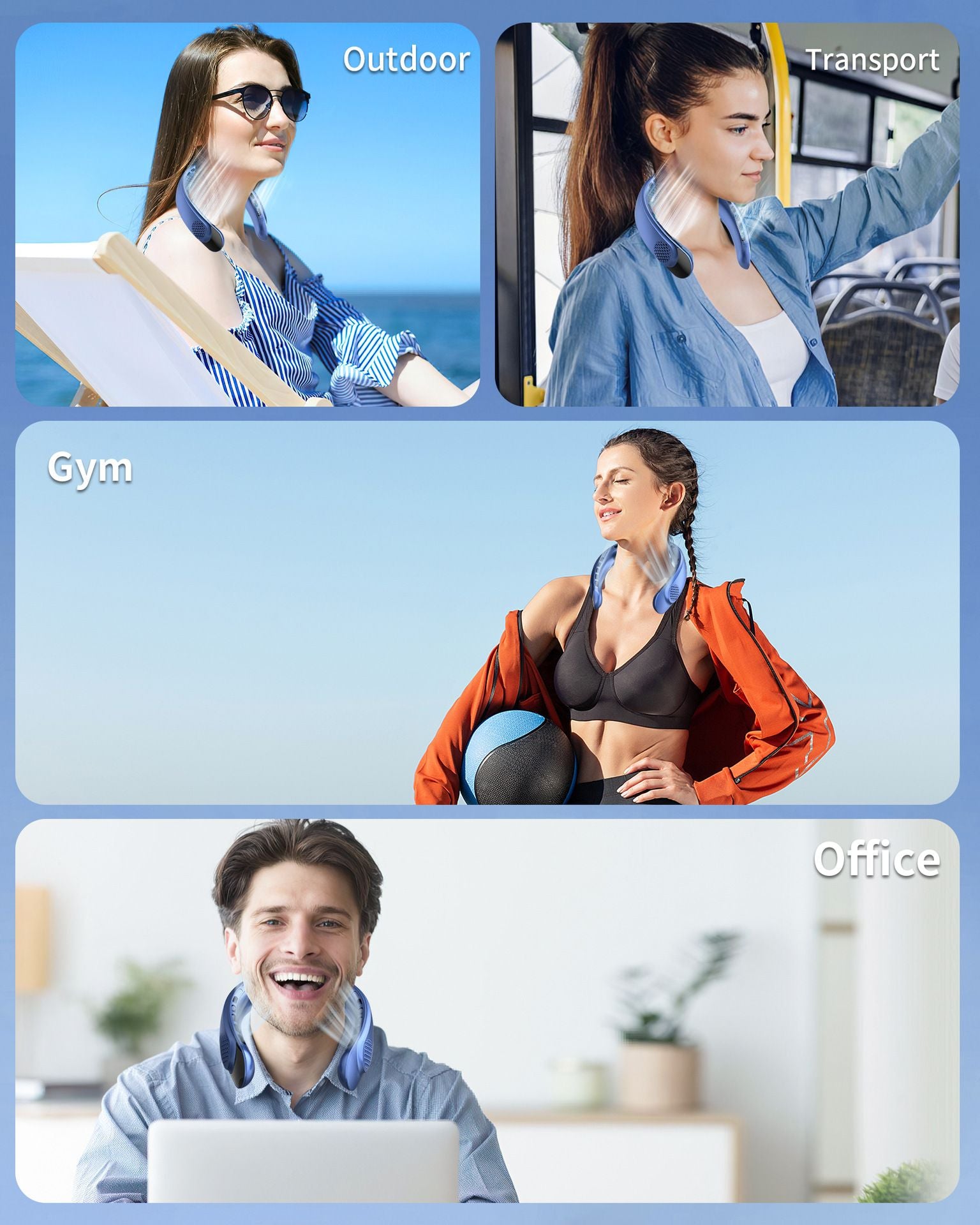 The wearable neck fan adopts ergonomic design, the neck width can be adjusted, and it is comfortable to wear. The fan is equipped with a breathable neck brace to reduce the contact area between the fan and the skin, and it will not cause sweating and heat when worn for a long time. The compact size and lightweight design are easy to carry, allowing you to enjoy refreshing wind anytime and anywhere.
