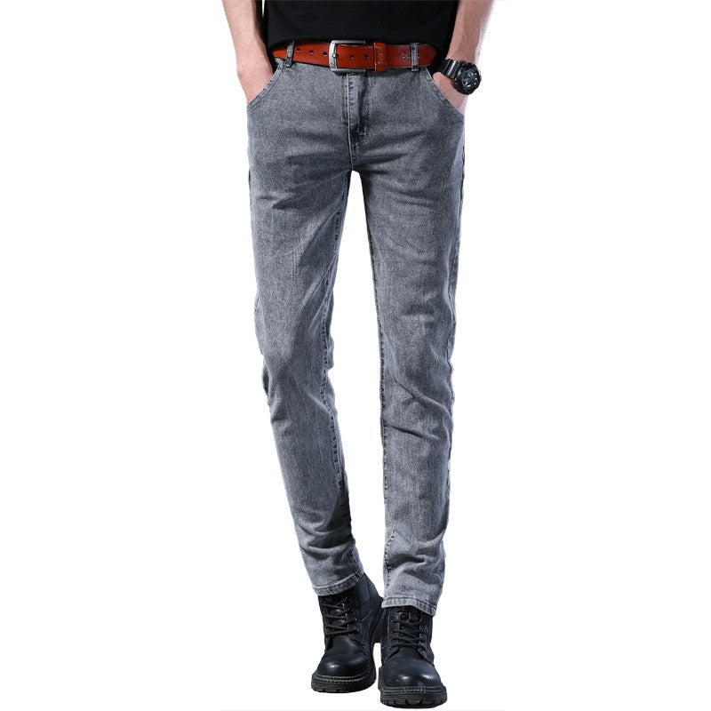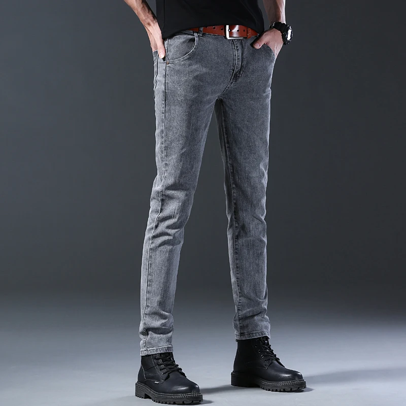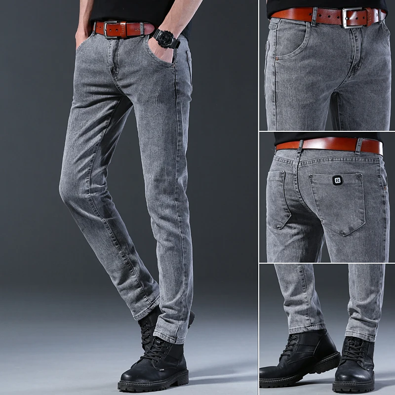 New style jeans, men's slim fit, Korean style comfortable straight leg elastic gray mid waist pants, men's casual denim pants
