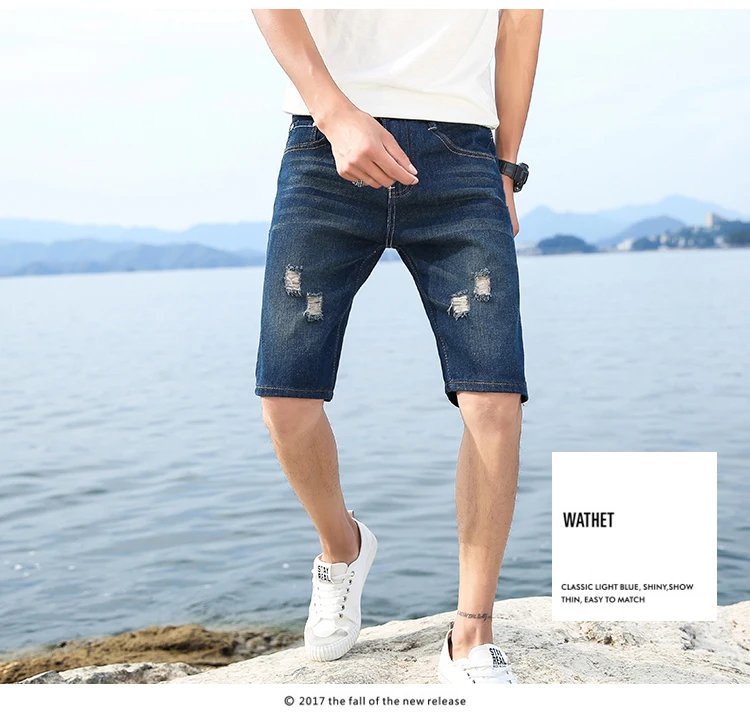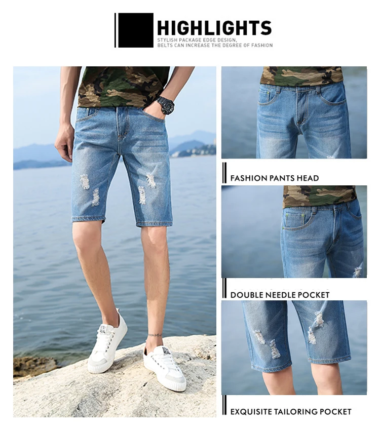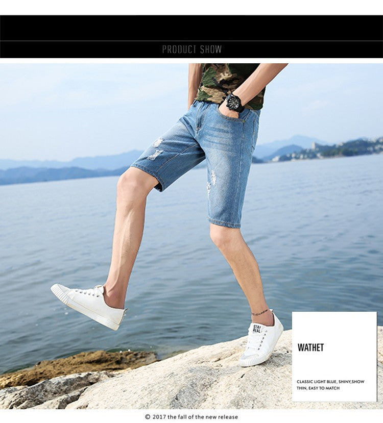 New Summer Men's Personalized Washable Perforated Denim Short Pants Male Casual Straight Short Jeans