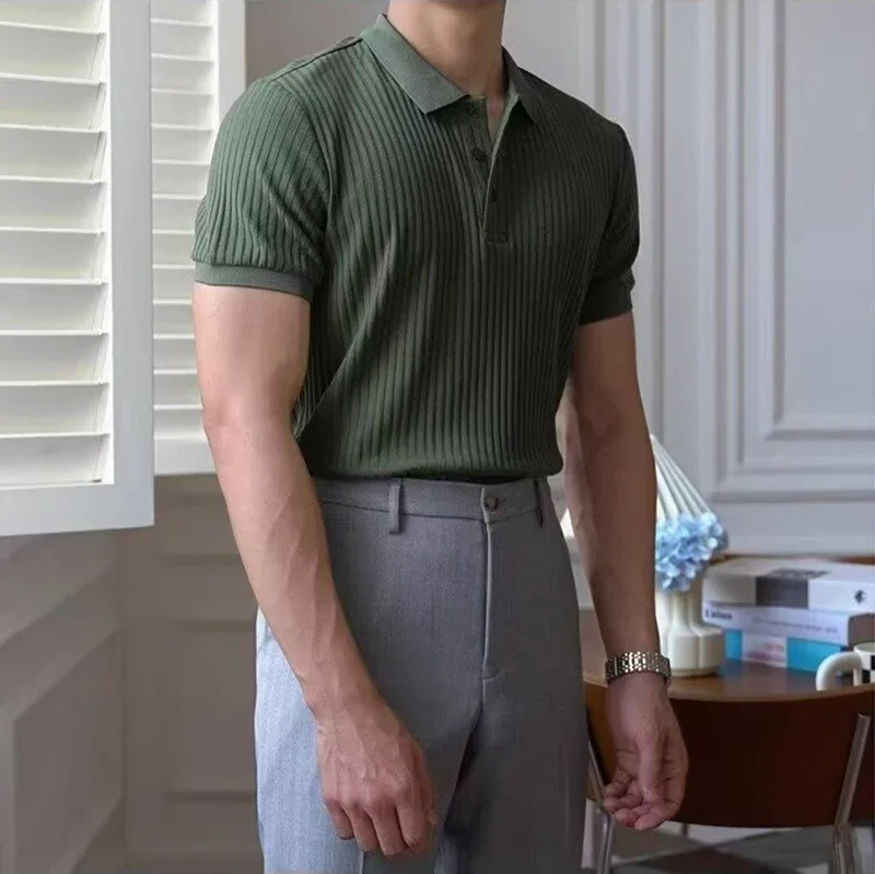 New Vertical Stripe Knit Polo Men's Shirts Summer Slim Solid Color Breathable Turn-Down Collar Business Short Sleeve Polo Tops