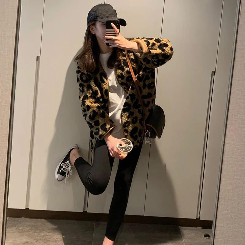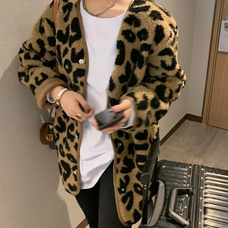 New Vintage Leopard Print Winter Warm Coats Female Fashion Lightweight Lamb Wool Jacket Women Casual Loose Plush Short Outerwear