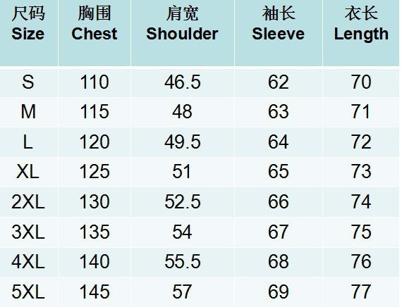 5XL =Bust 145cm , Length 77cm, Sleeve 69cm ,For Weight 120-130kg;