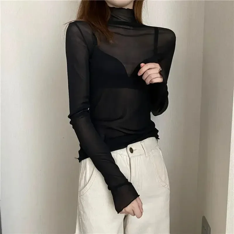 New Women Floral Lace Shirt Spring Autumn Long Sleeve Sexy Mesh Bottoming Shirts Mock Neck Blouse T-Shirt Pullover Top