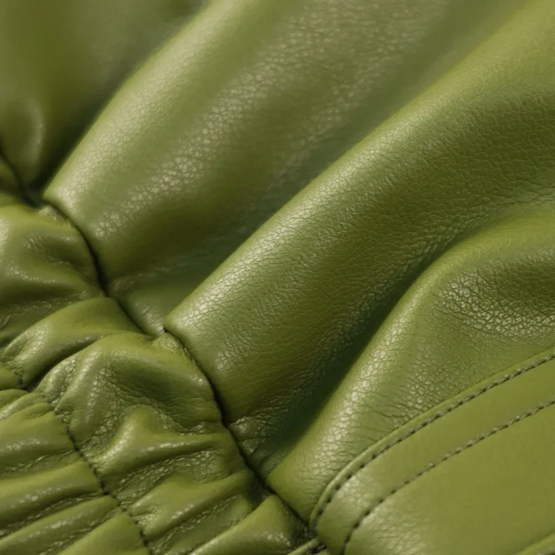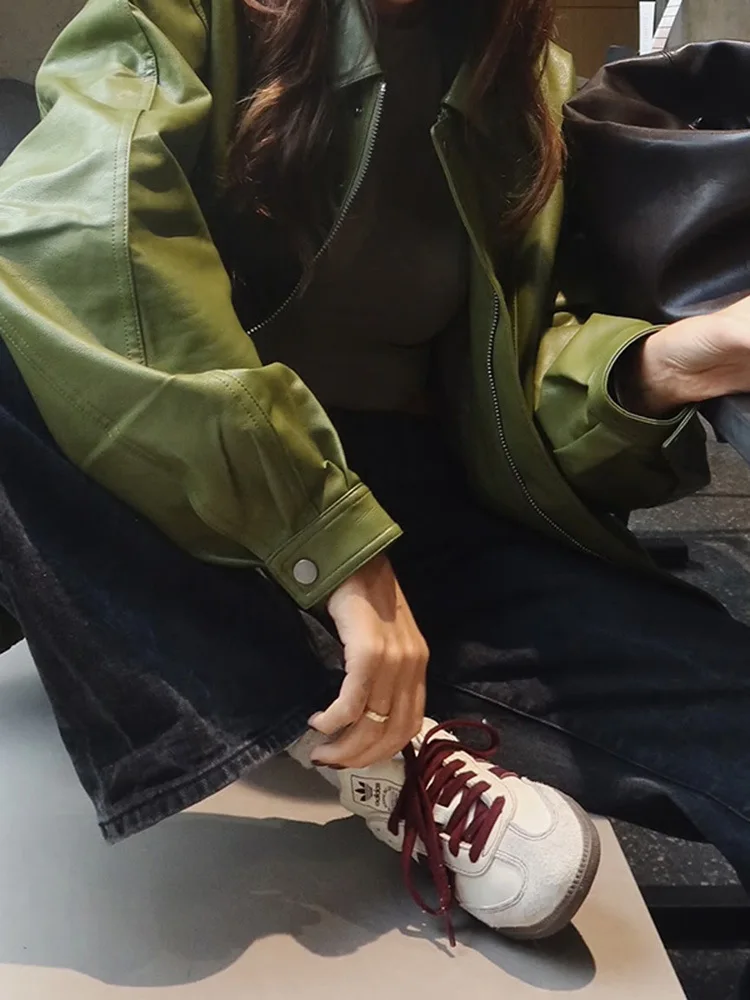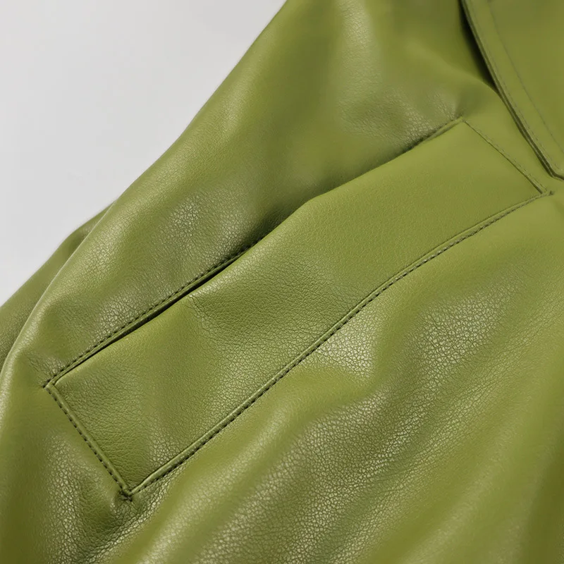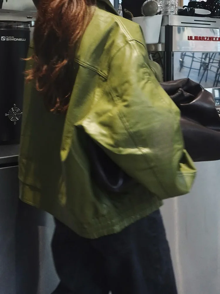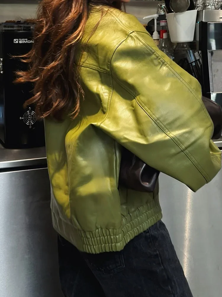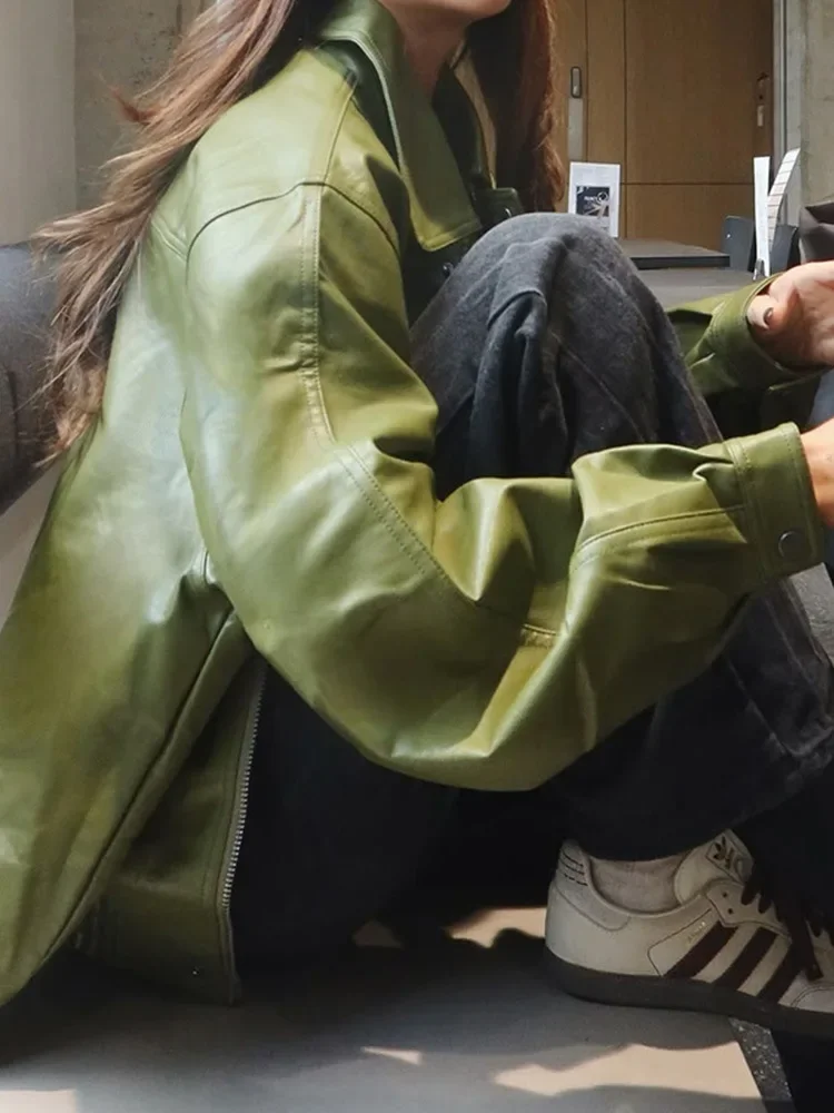 Olive Green Leather Jacket Coat Silhouette Vintage High Street Trend Zipper Lapel Short Overcoat Loose Casual Top Outwear Autumn
