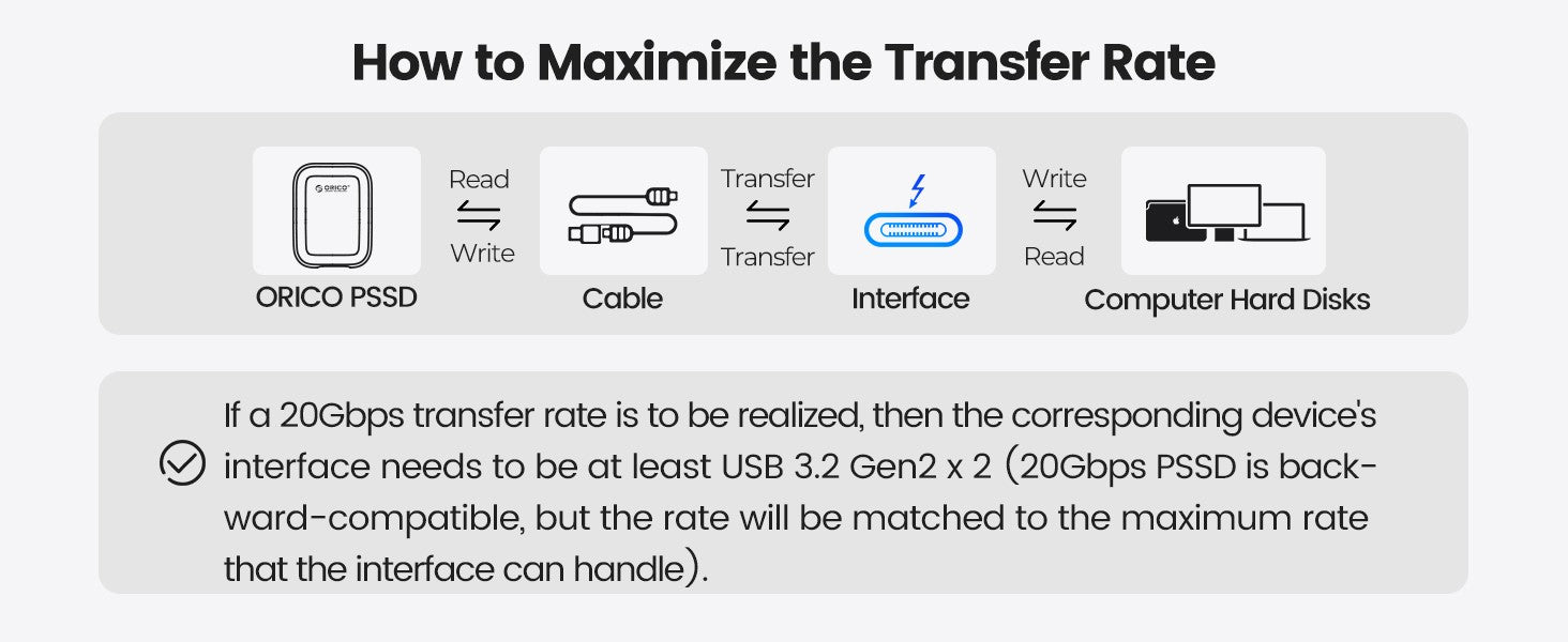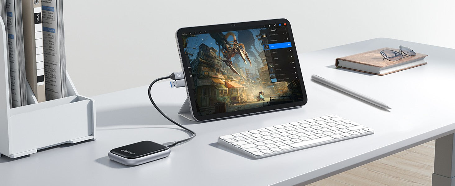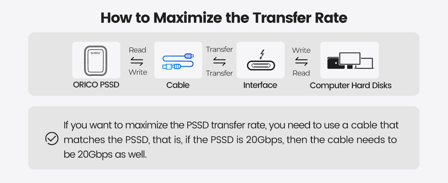 The ORICO A20 PSSD supports up to 20Gbps (2000MB/s) for instant recording of your creative inspirations. (Note: Since any Apple product interface only supports 10Gbps and Thunderbolt transfer, the maximum transfer rate of all 20Gbps External SSD on Apple products is 1000MB/s. If you need higher speed, please choose ORICO's Thunderbolt products.)