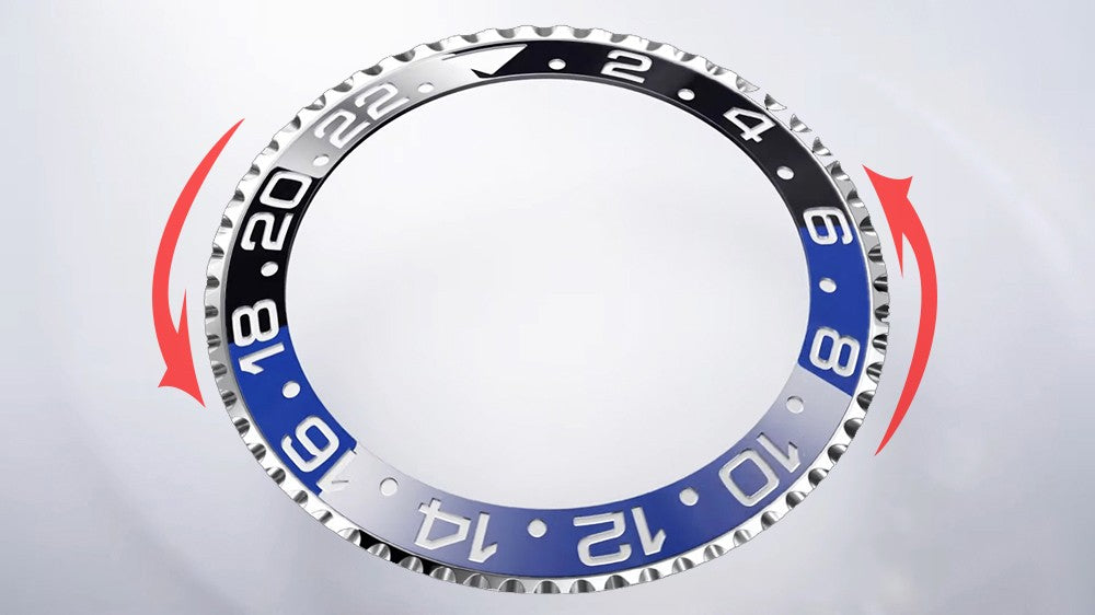 • Ceramic rotating bezel for setting the timer