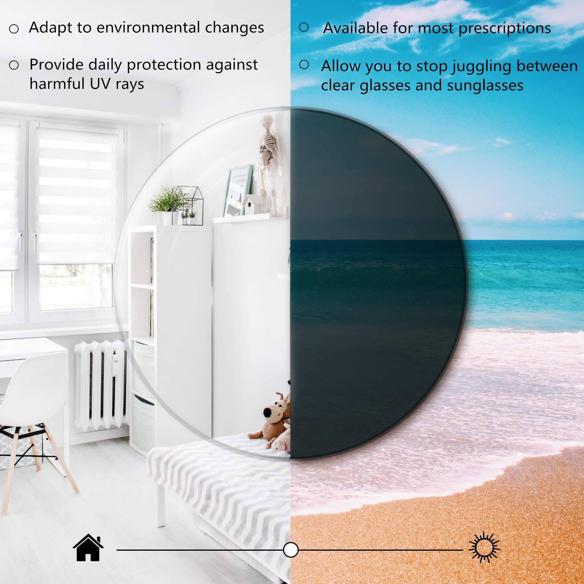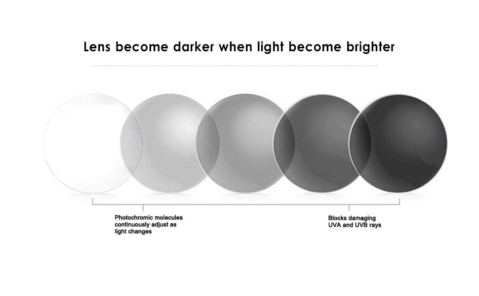 Photochromic Reading glasses Lenses are clear when indoors or at night and automatically darken to a sunglasses tint when exposed to UV sunlight. Lenses will begin to clear as soon as they are away from UV sunlight, and will be noticeably lighter and mostly clear within a few minutes. They absorb UV radiation that can otherwise damage your eyes. They are an excellent solution for people who hate constantly switching between their reading glasses and their shades.