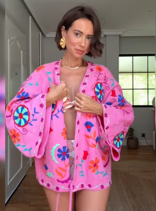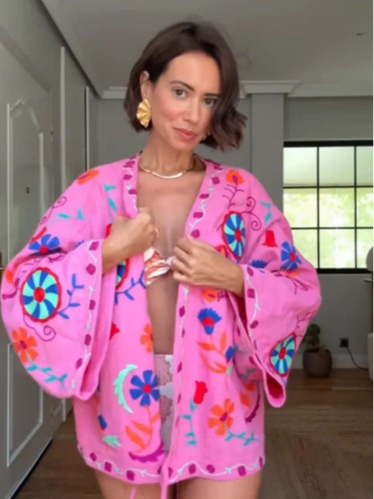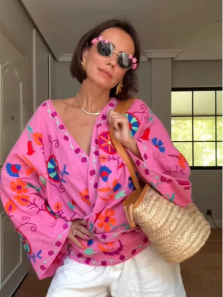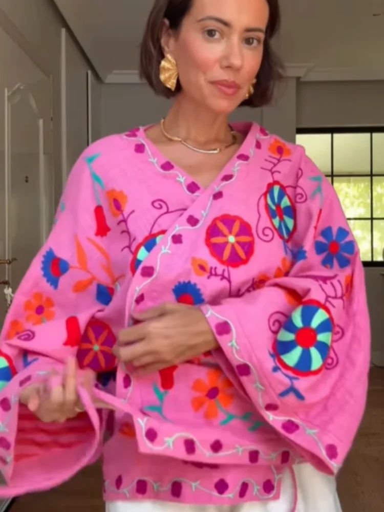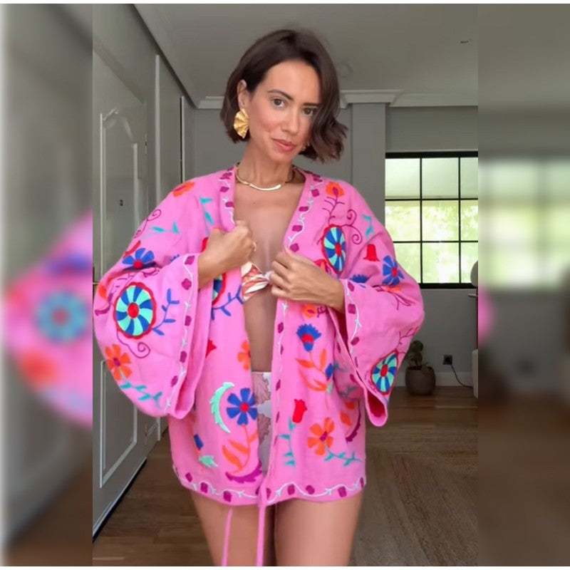 Pink Embroidery Cotton Linen Short Coat Woman Casual Lace Up Long Sleeves V Neck Jacket New Autumn Lady Street Printed Outerwear