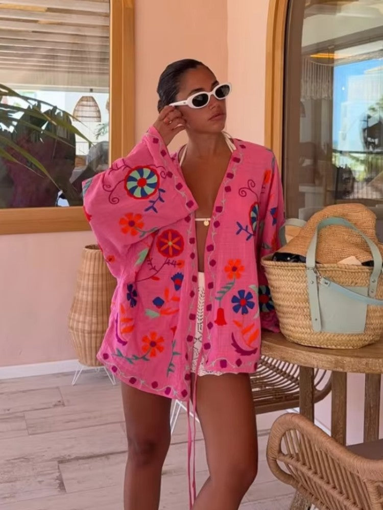The jacket features a delicate embroidery design, adding a touch of elegance and femininity to your casual wear.