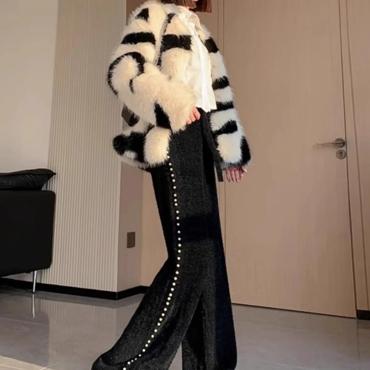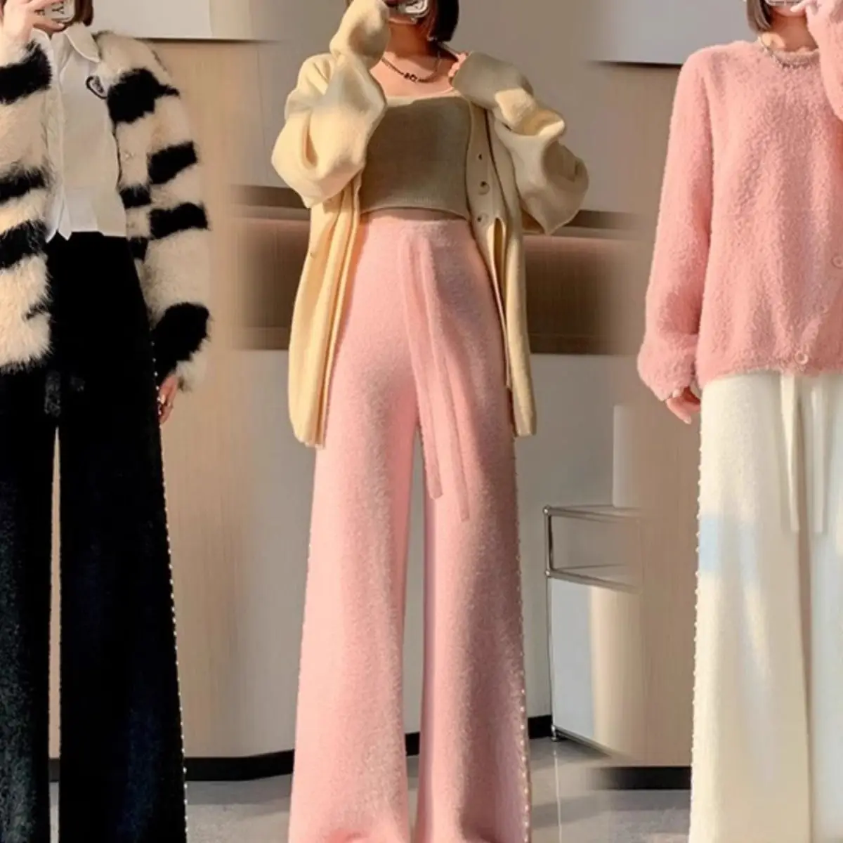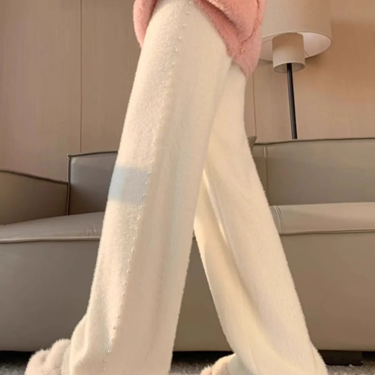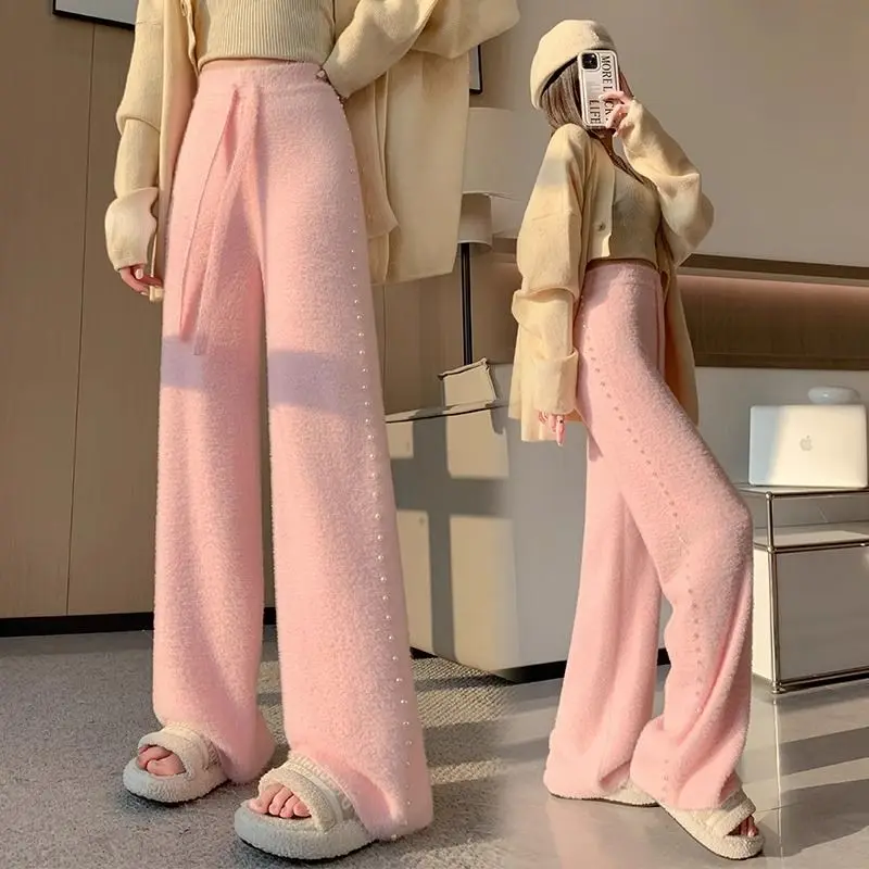 Pink Mink Fur Nail Bead Knitted Wide Leg Pants for Women in Autumn and Winter Lazy and Relaxed Casual Straight Leg Long Pants