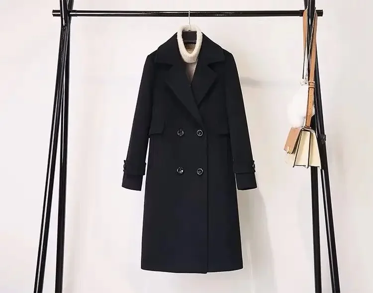 Plus Size Black Woolen Coat 2025 New Style Women's Autumn Winter Professional Mid-Length Trendy Polyester Fiber Suit Collar F...
