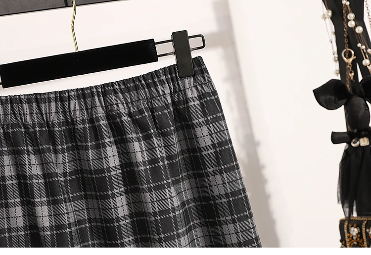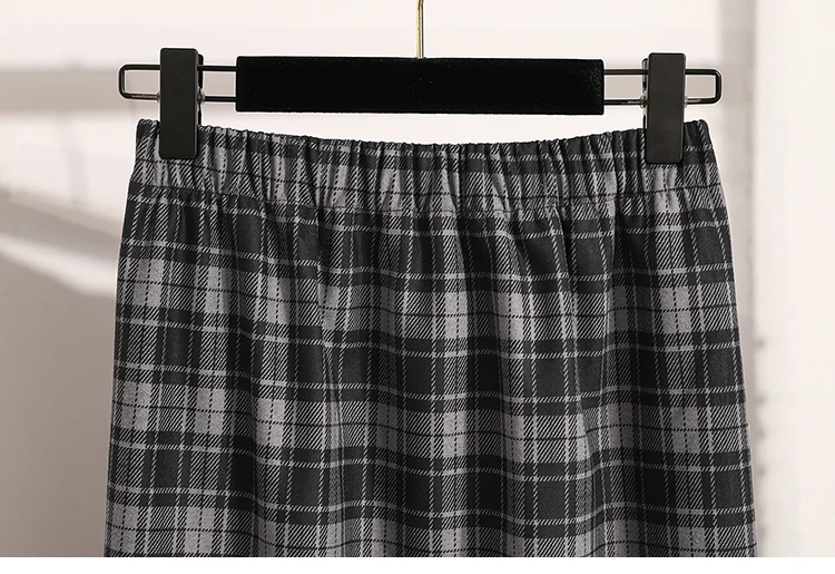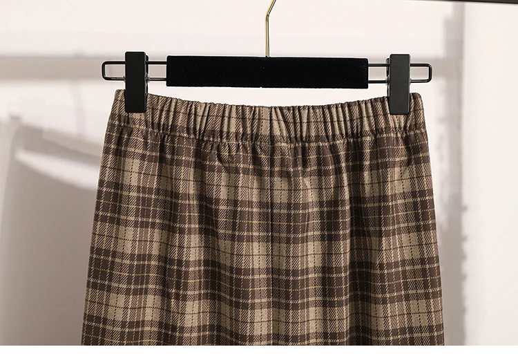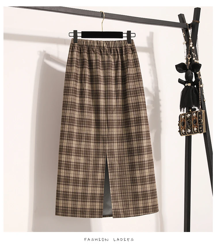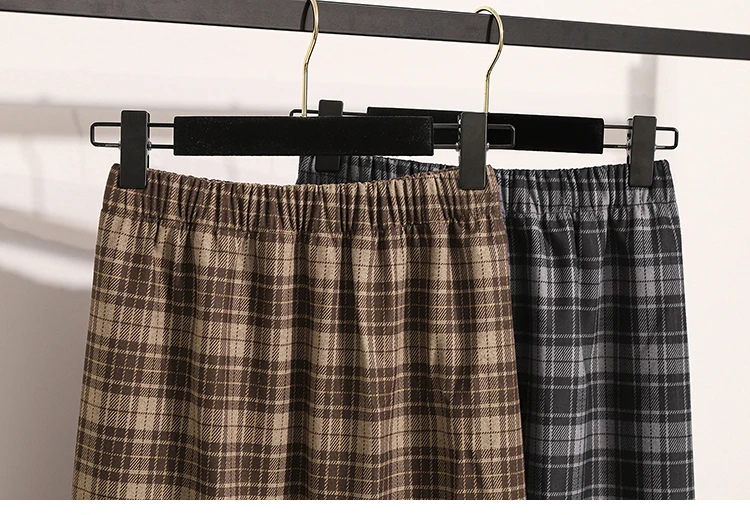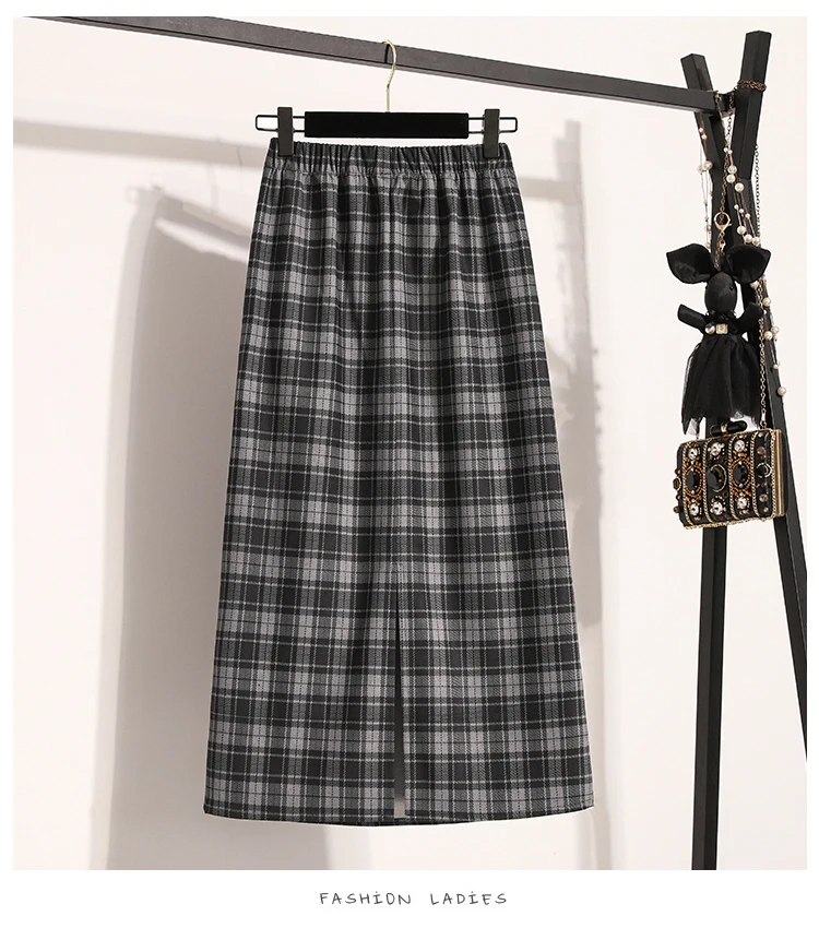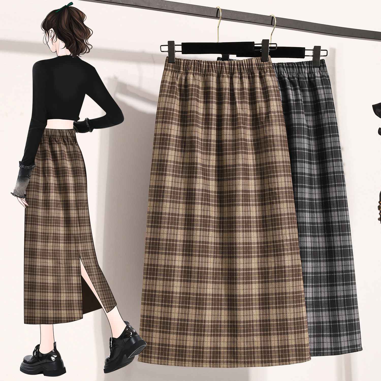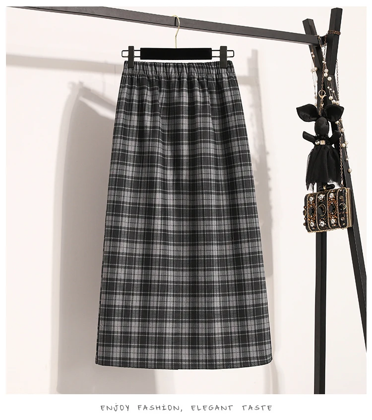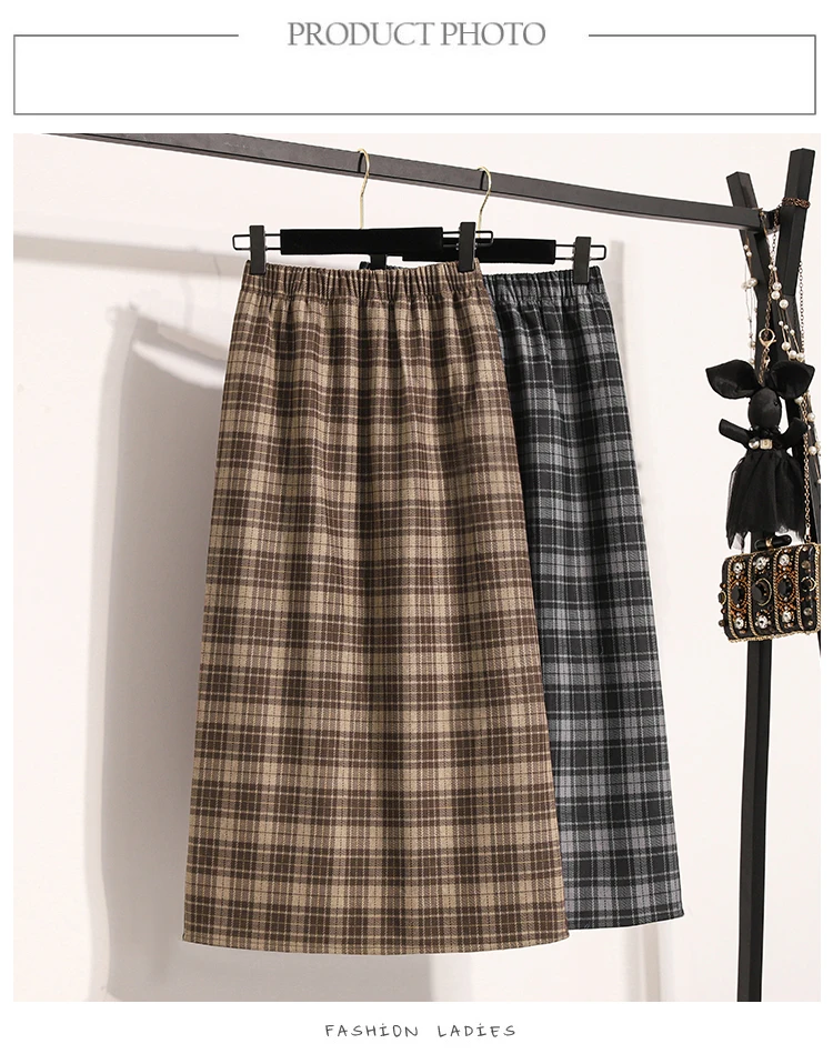 Plus Size Skirt Women 2024 Autumn Winter High Elastic Waist A Line Gray Or Khaki Plaid Skirt Korean Casual Long Skirts Womens