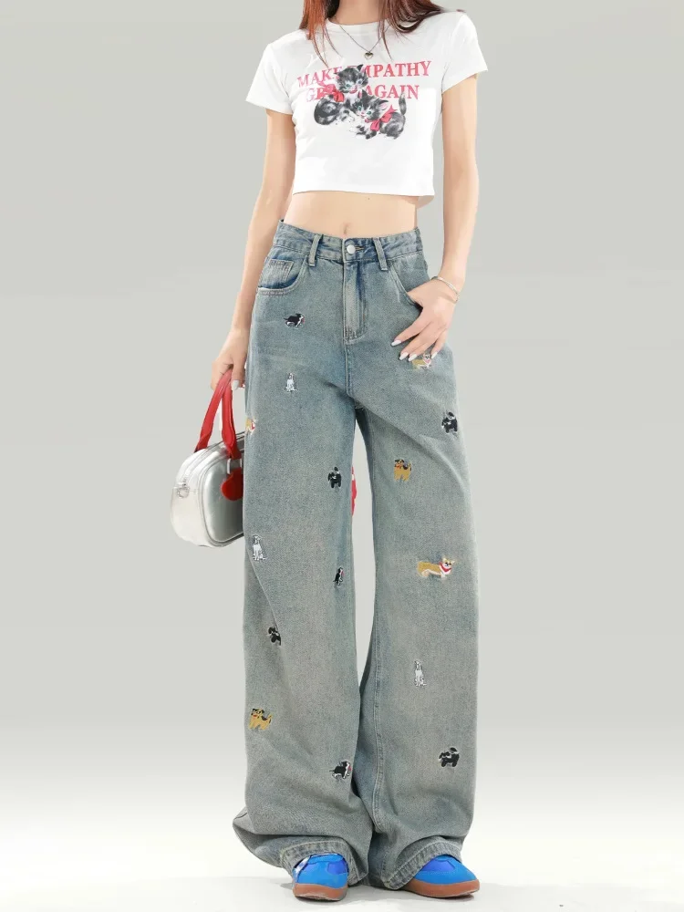 • American Style Embroidery : Featuring intricate black puppy embroidery, these jeans add a touch of American style to your wardrobe.
