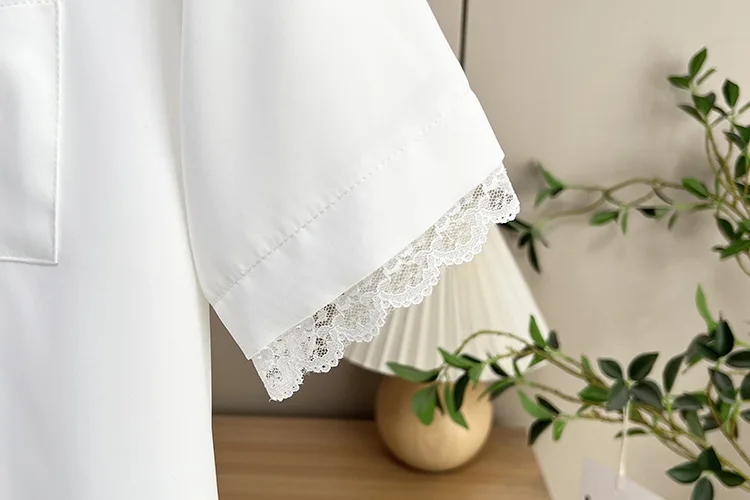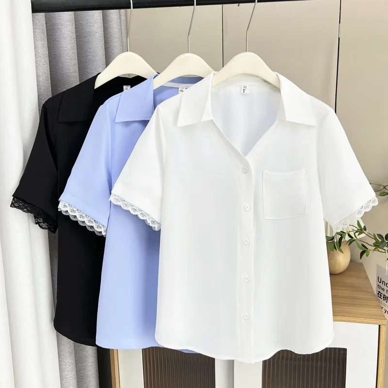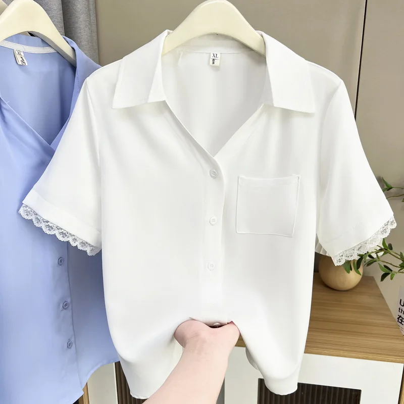 Plus Size Women's Summer New Style Lace Sleeve V-Neck Short Sleeve Shirt Fresh And Elegant Fashionable Blouse Polyester Fabric