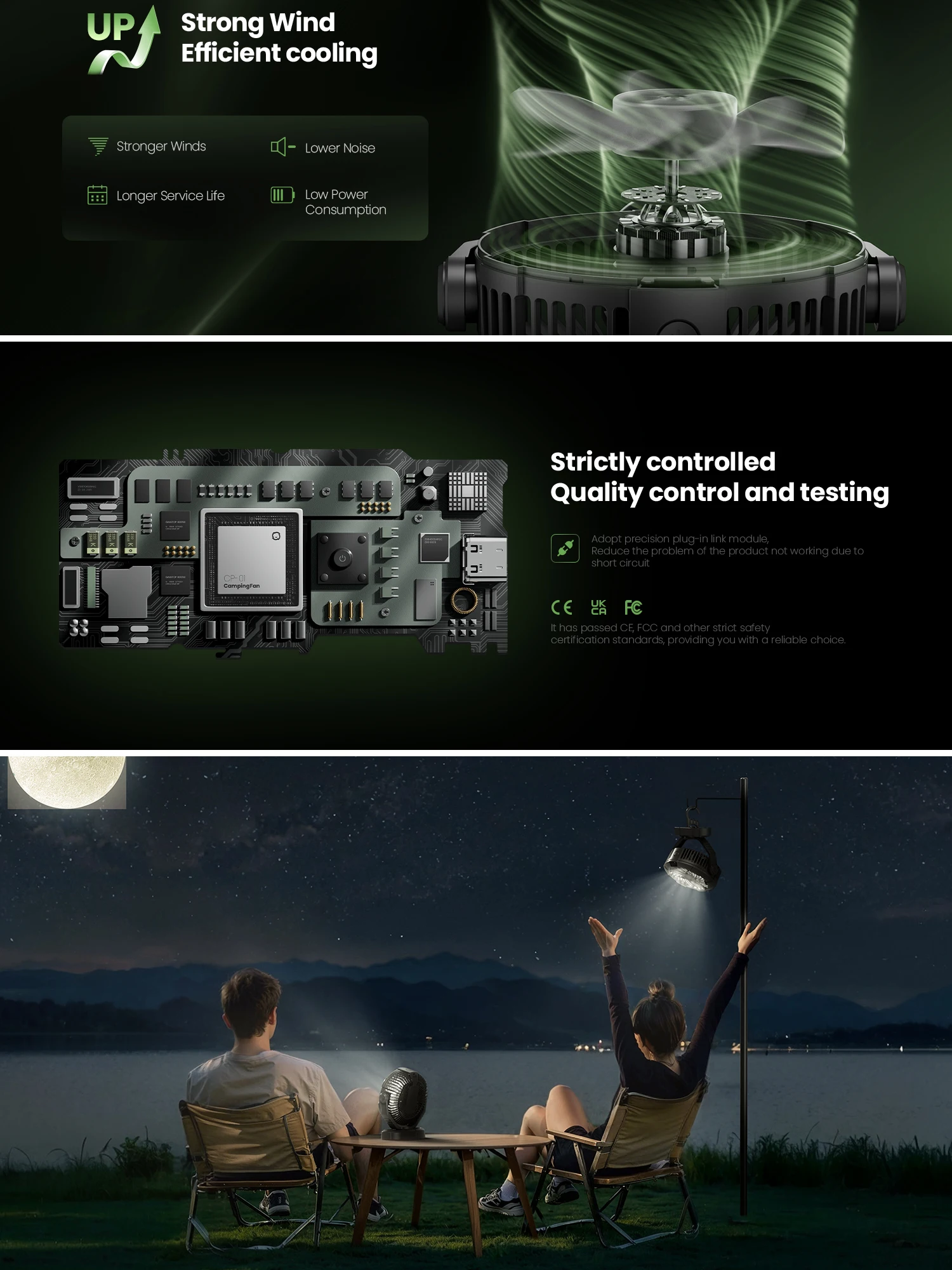 【Three-Speed Airflow】This tent fan has 3 modes to make the airflow exactly as you want: low speed, medium speed and high speed. High speeds are very powerful, move a lot of air, and cool you down more effectively. powerful and consistent airflow to help you beat the heat, and create a more inviting and enjoyable outdoor experience for family and friends.