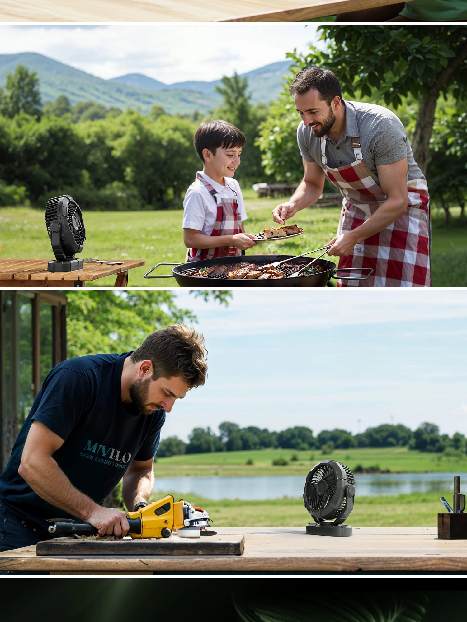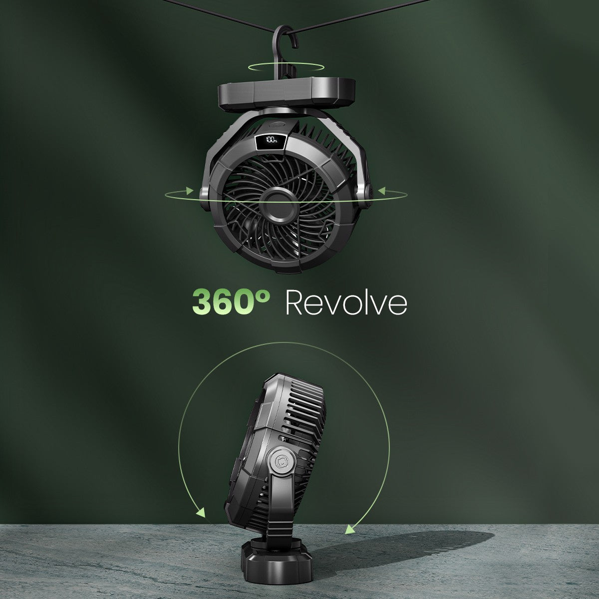 【360° Rotation & Hook Design】The camping fan supports 360° manual adjustment up, down, left, and right, allowing you to obtain airflow from different directions. The camp fan built-in foldable hook is convenient for hanging, and can be hung in tents, cars, tree branches, walls, and other indoor and outdoor environments.