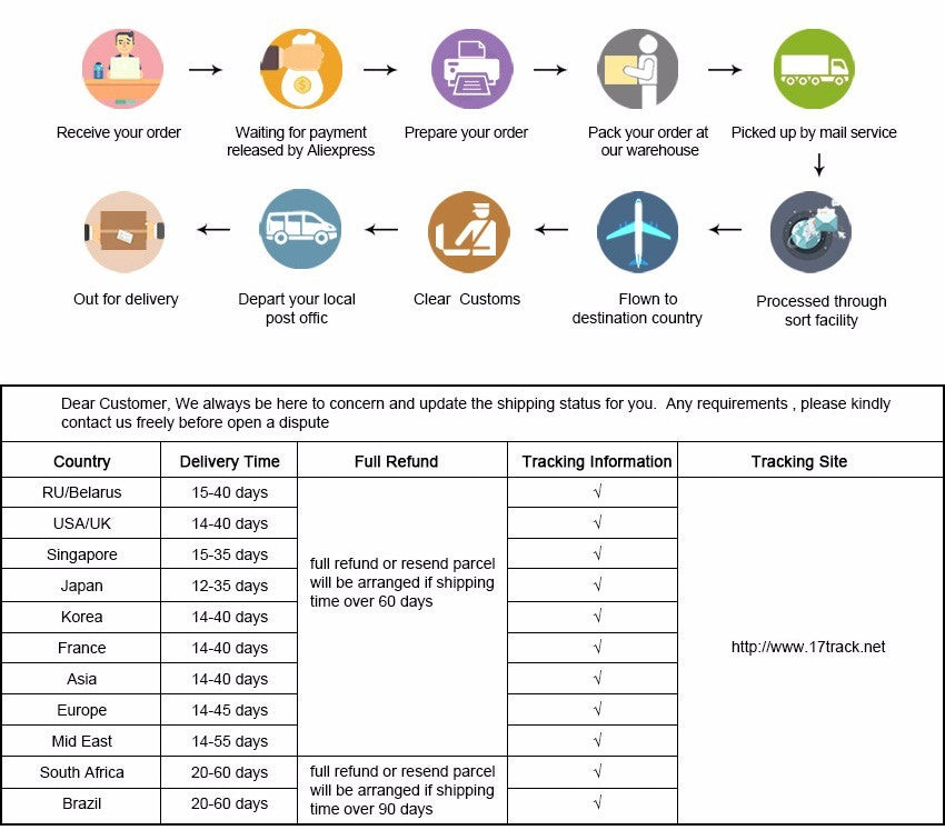 We provide with all kinds of shipping method, like AliExpress Standard Shipping, ePacket,China Post Air, DHL, Postnl, FedEx, EMS. If you want to specify the shipping method, Please contact us and we are happy to help you.