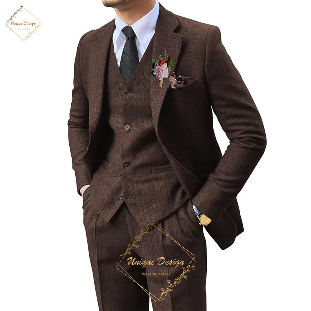 Premium Men's Suits 3 Piece Jacket Vest Pants Brown Wedding Tweed Herringbone Retro Vintage Tailored Fit Single Breasted Tuxedo