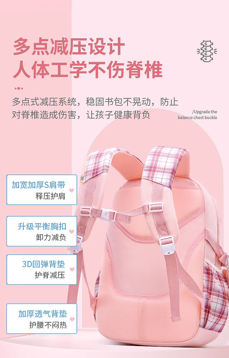 Protecting The Spine Ergonomics Elementary School Students Girls Checkered Backpack Large Capacity Lightweight Waterproof