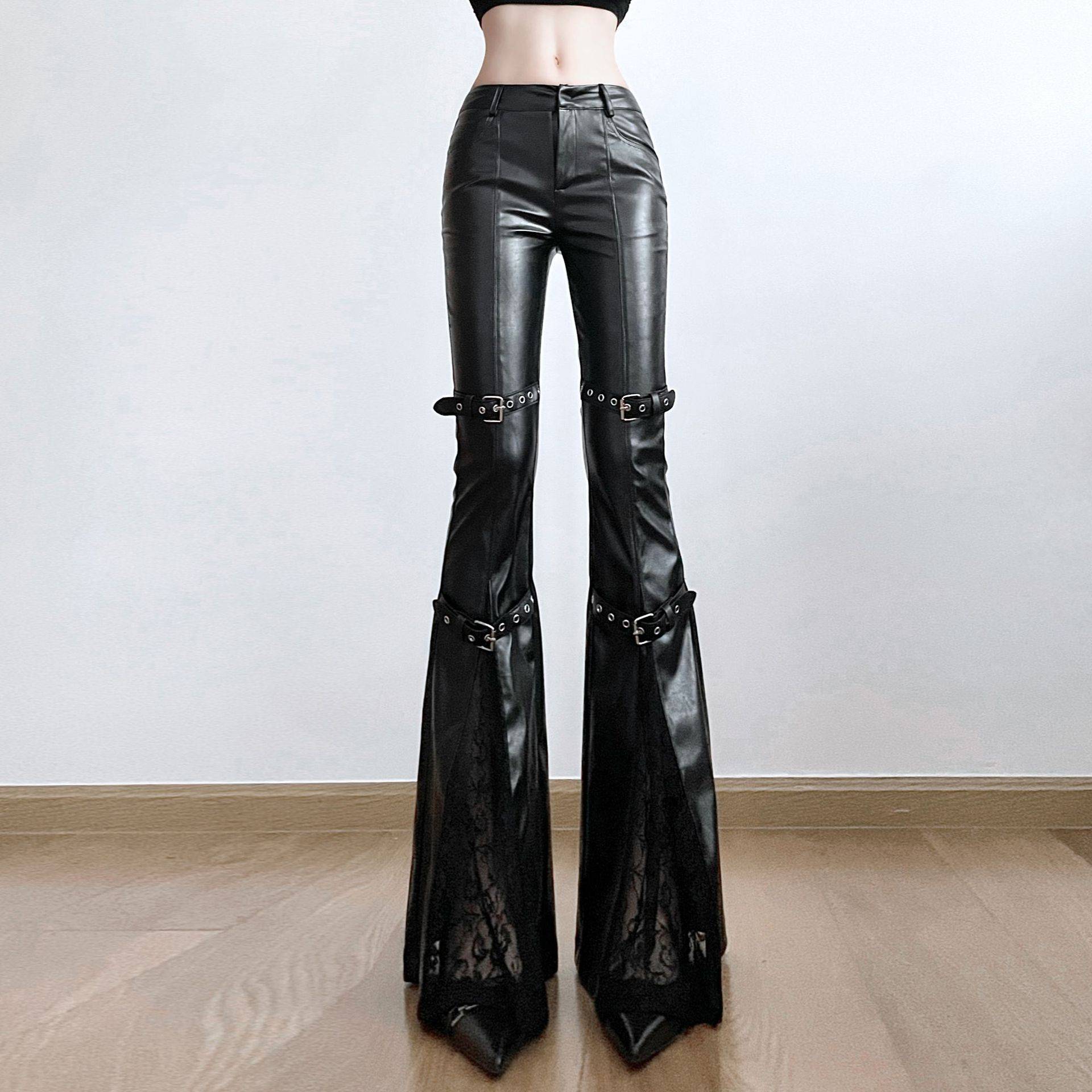 PU Leather Flare Pant Goth Buckle Lace Patchwork Pants Women Fashion Y2K Streetwear Vintage Aesthetics Casual Pants Trousers