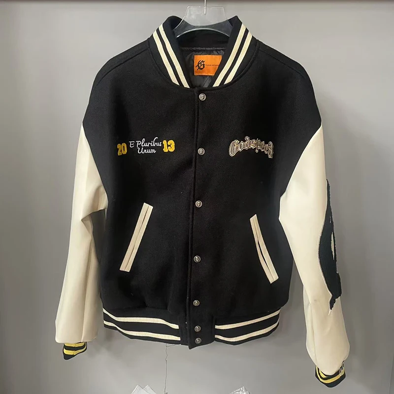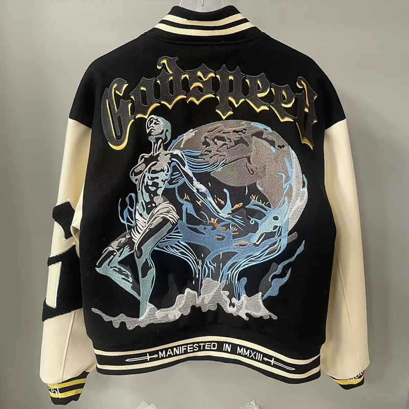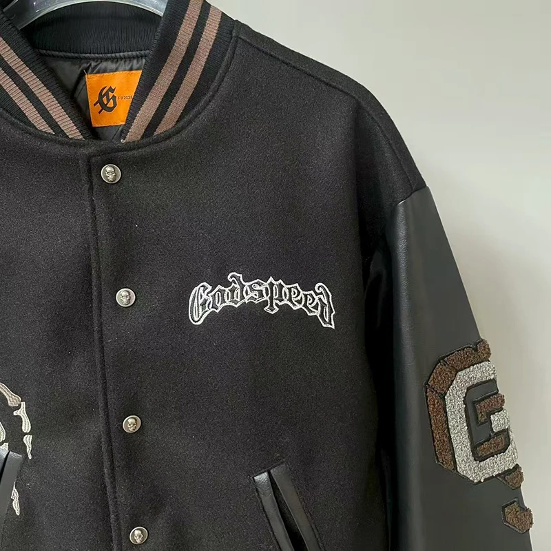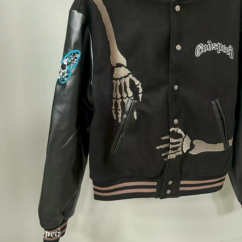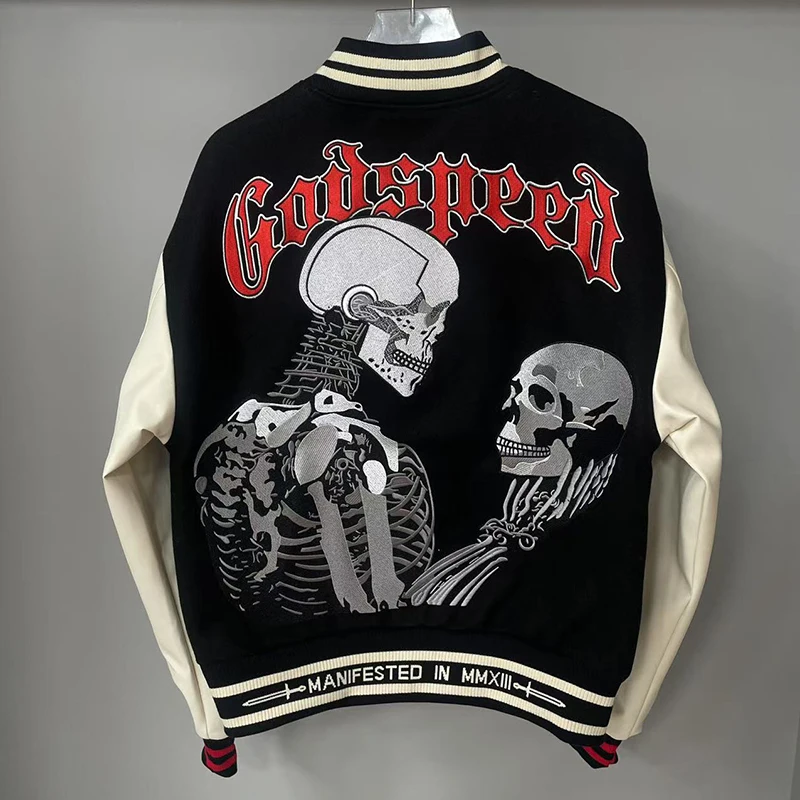Real Photo GOD SPEED Baseball Jacket American Vintage Patchwork Leather Sleeves Unisex Embroidery Skeleton Jacket Coats