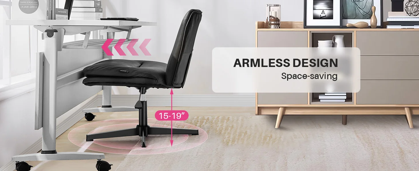 The office chair features a sleek and modern design, available in three colors: black, white, and brown. It is suitable for use in offices, home offices, studies, and gaming spaces. Additionally, its armless design allows for convenient storage.