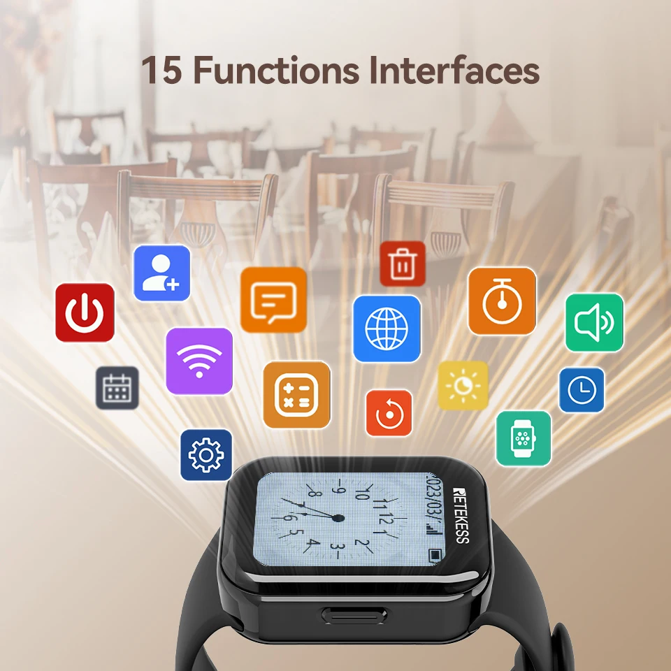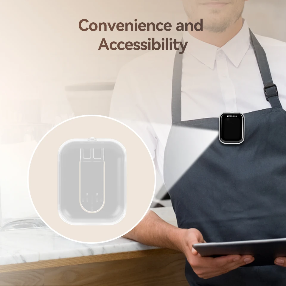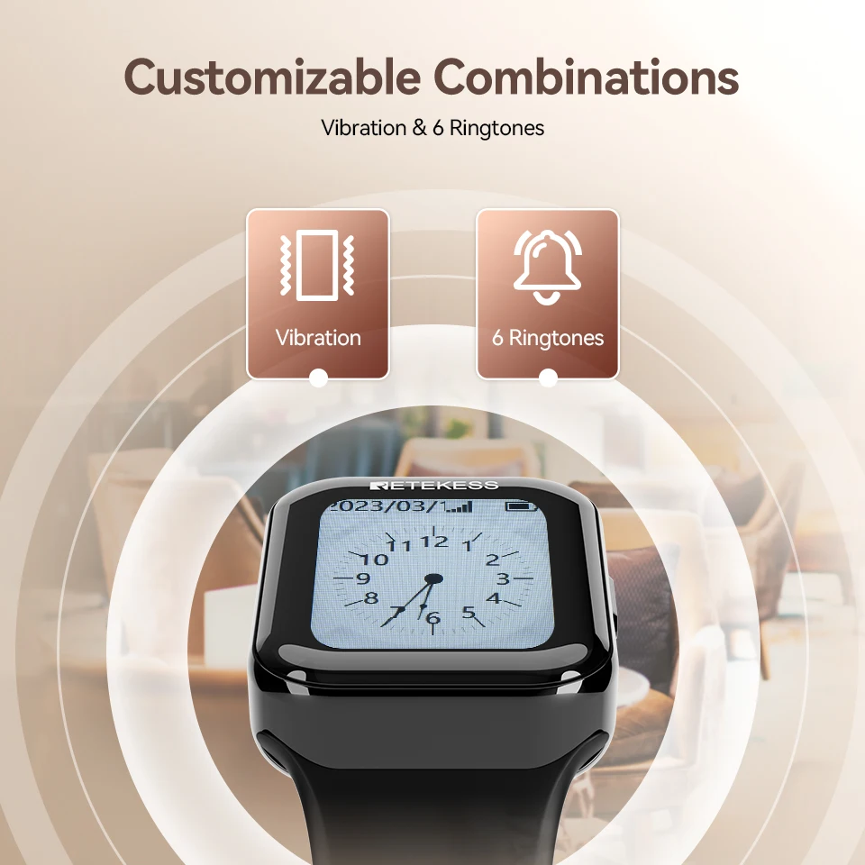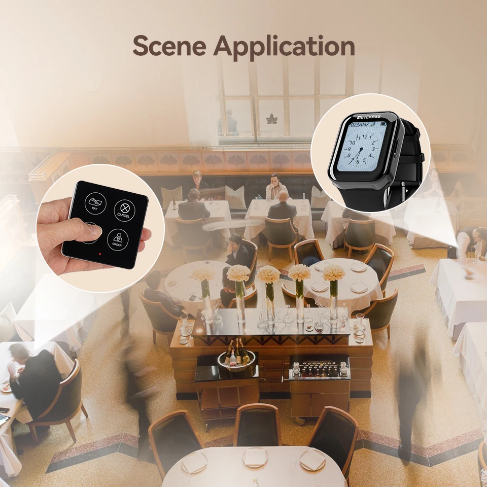 the watch receiver boasts a connection distance of up to 80M/200M; allowing for unrestricted mobility within your dining space; this extensive range ensures seamless communication between guests and staff;
