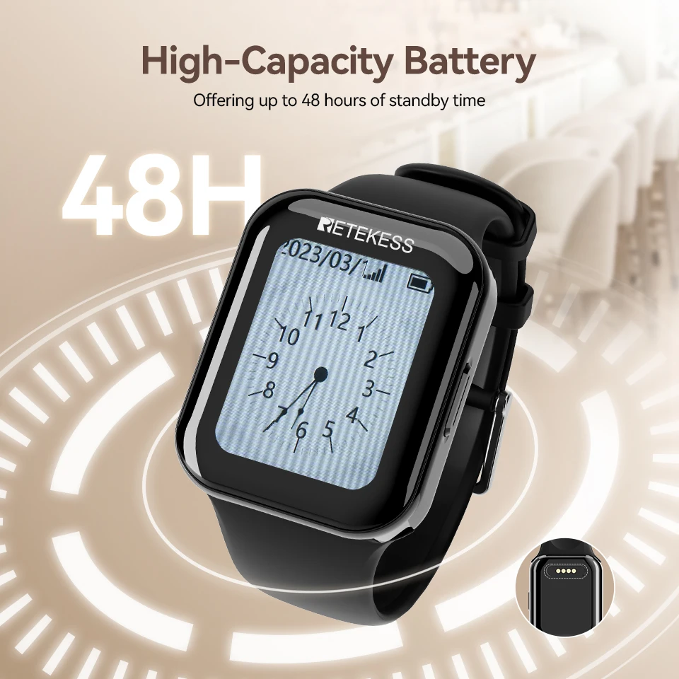 The Retekess TD113 Black Watch Receiver boasts an IP67 waterproof rating, equipped with a 500mAh super lithium battery that ensures a maximum standby time of up to 48 hours. Paired with 15 call buttons, its two watch receivers cater to various needs, delivering prompt services and projecting a professional image.