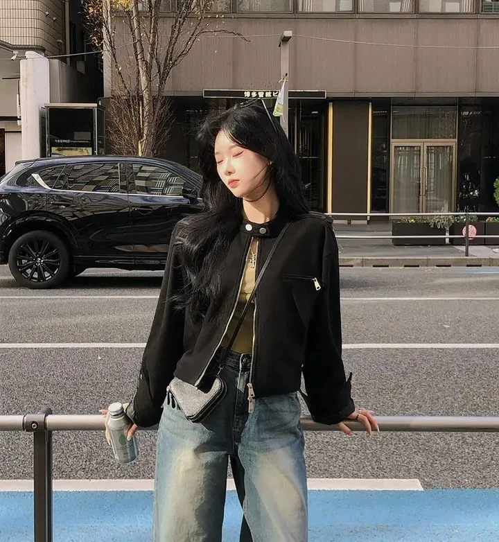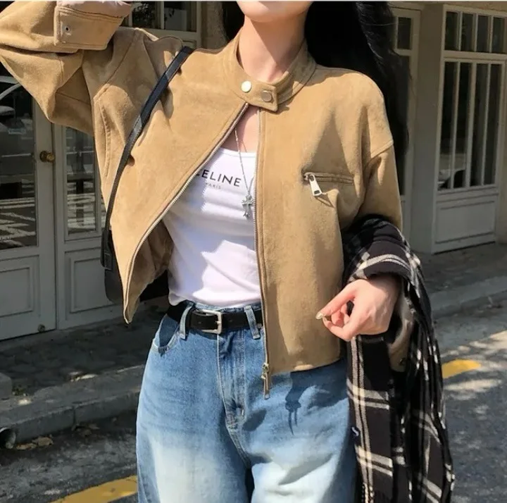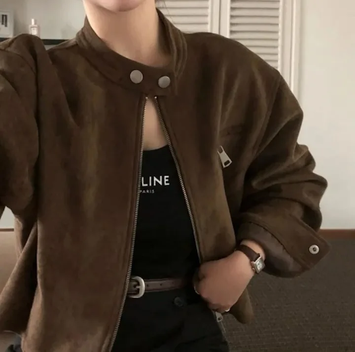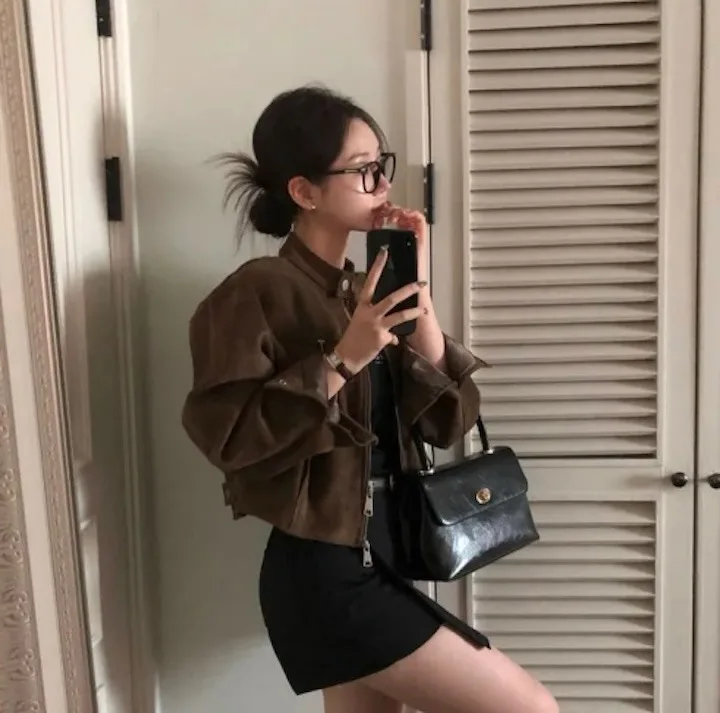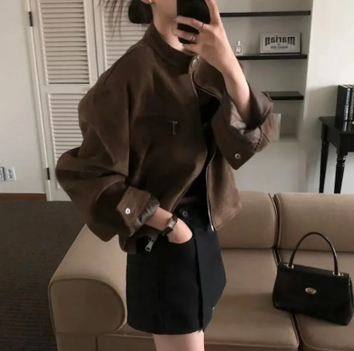 Retro American Coffee Brown Copper Zipper Button Short Jacket 2025 Autumn Trendy PU Leather Jacket Versatile for Dynamic Women