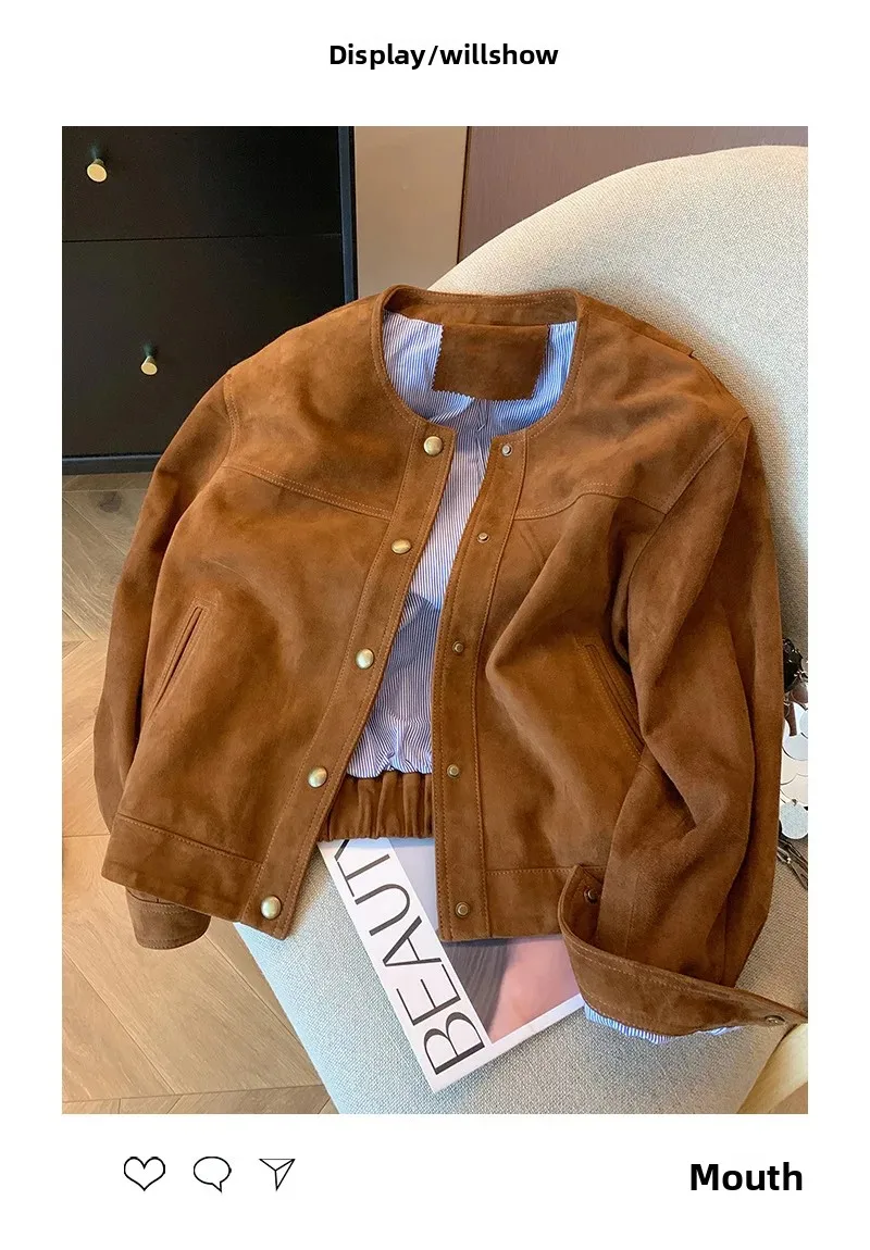 Retro Brown Suede Short Jacket Women's Spring Autumn Casual Loose Design Sense Meral Jacket Top round Neck Full Sleeve