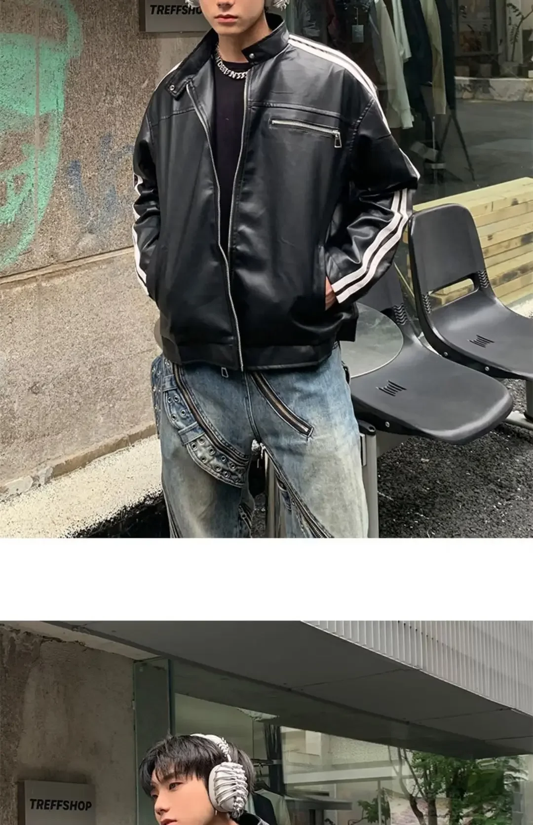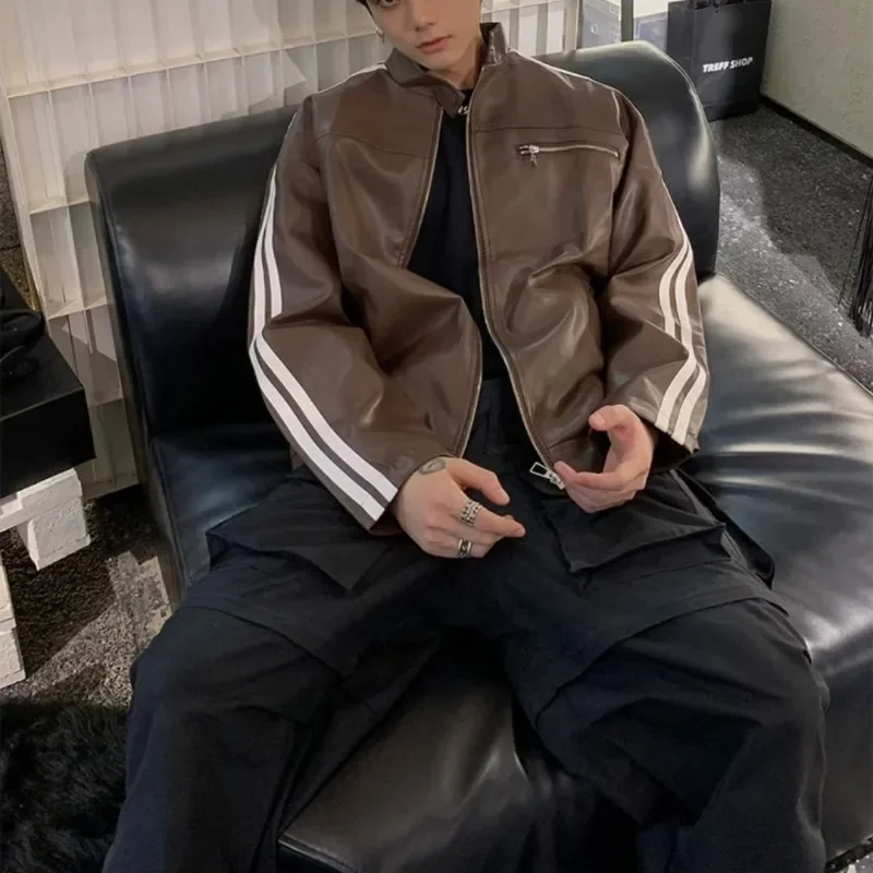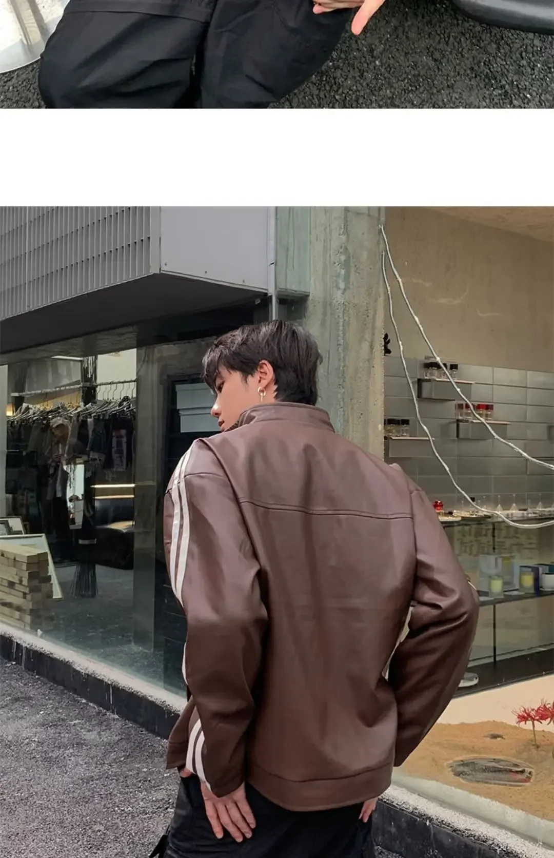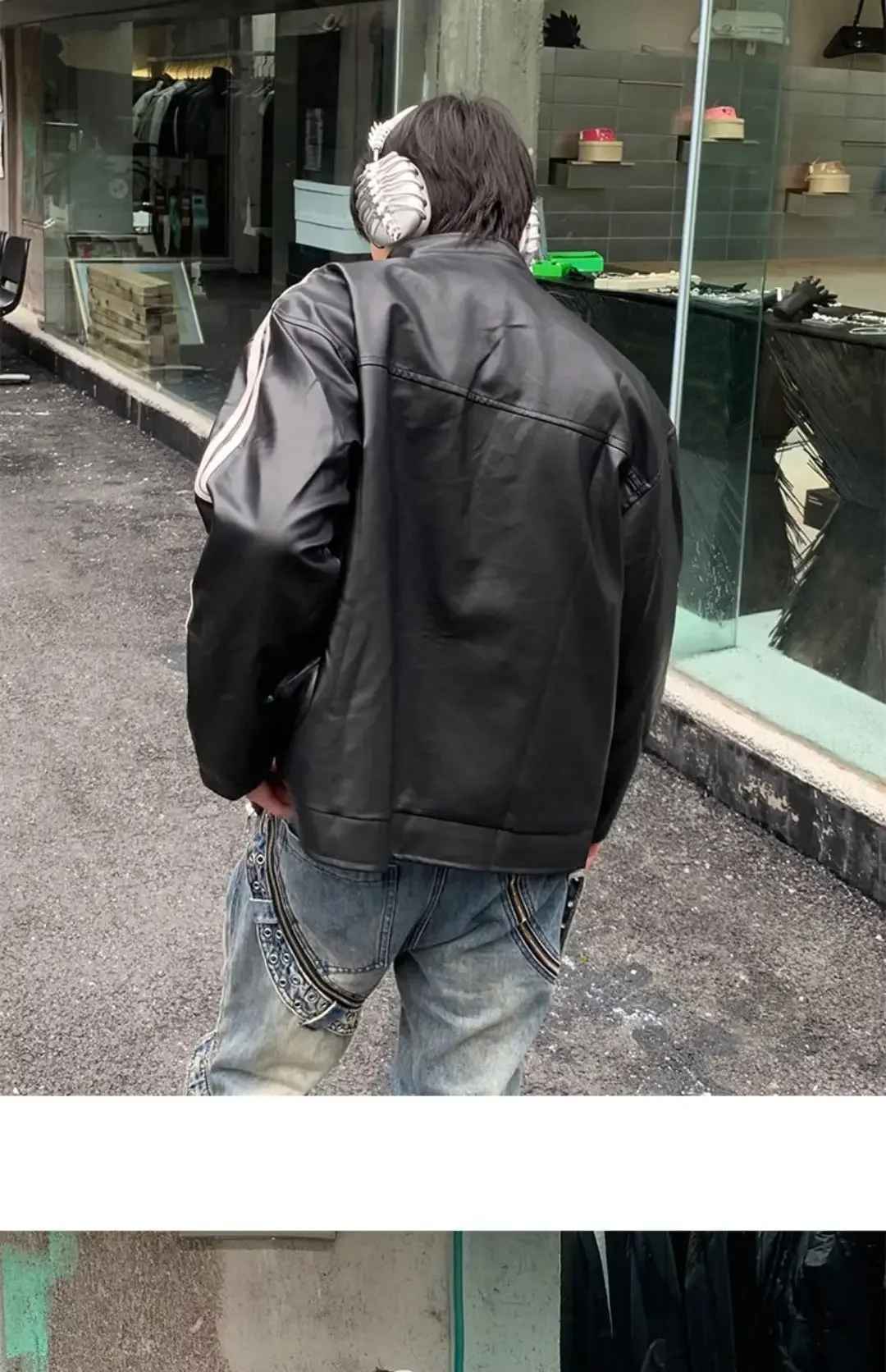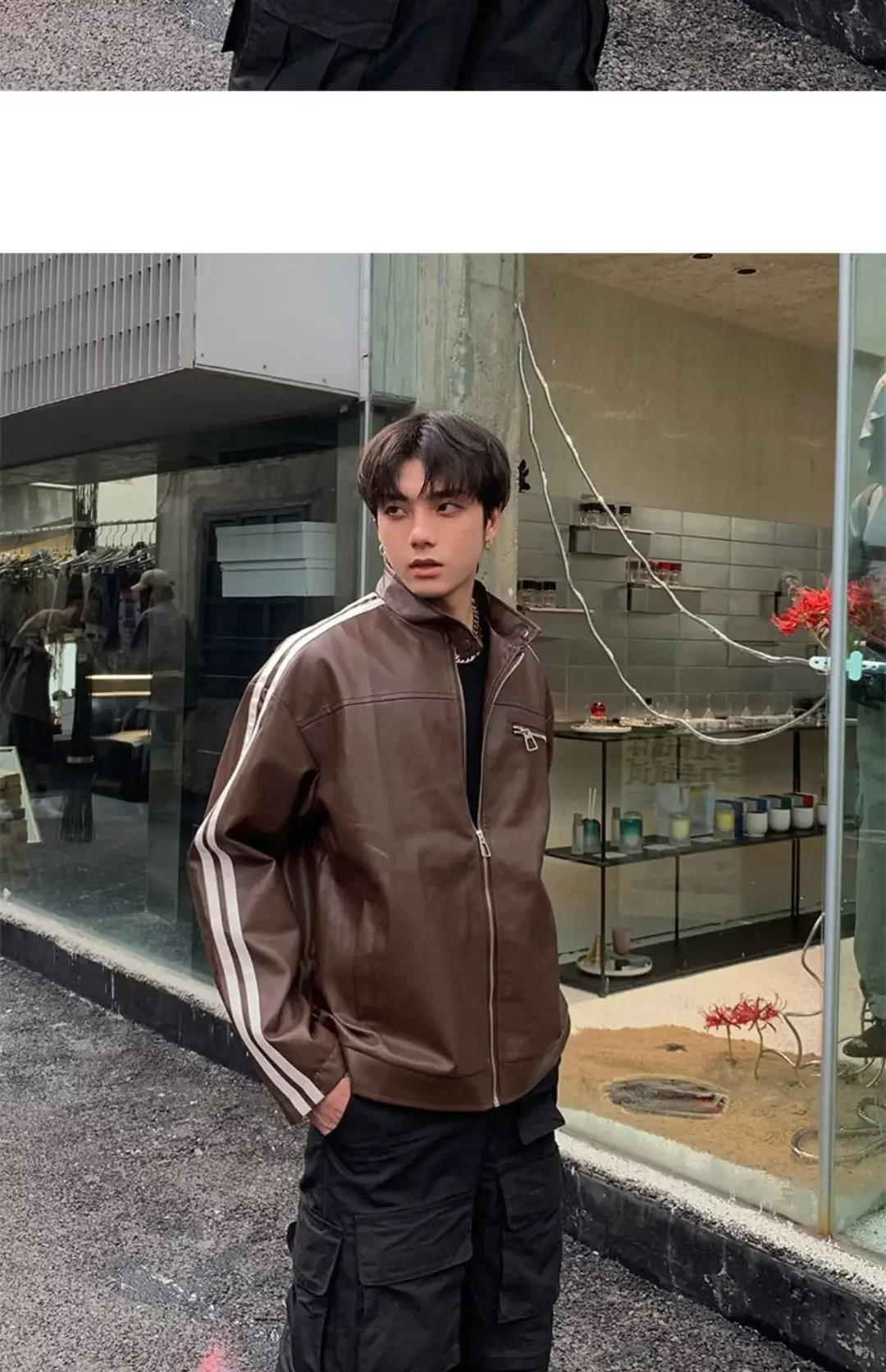 Retro Leather Jacket Men Women  American Patchwork Strip Racing Outerwear Loose Hip Hop Zippers Brown PU Coat Streetwear Spring