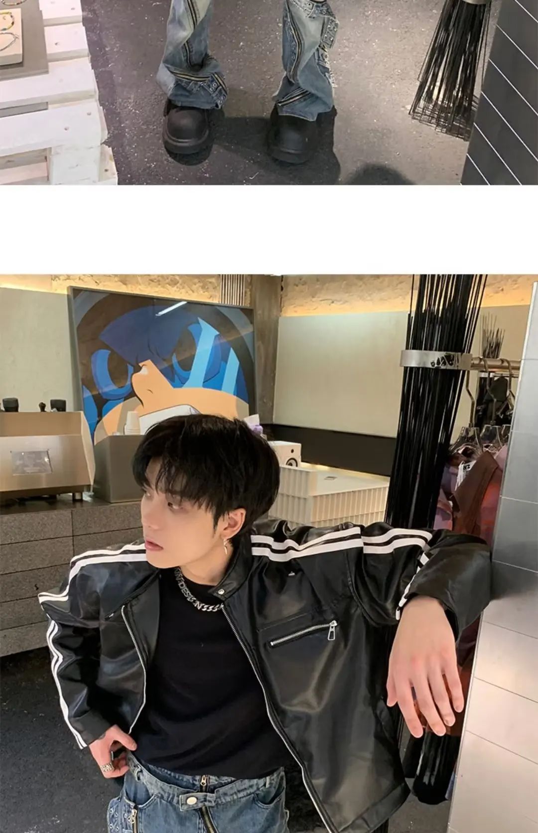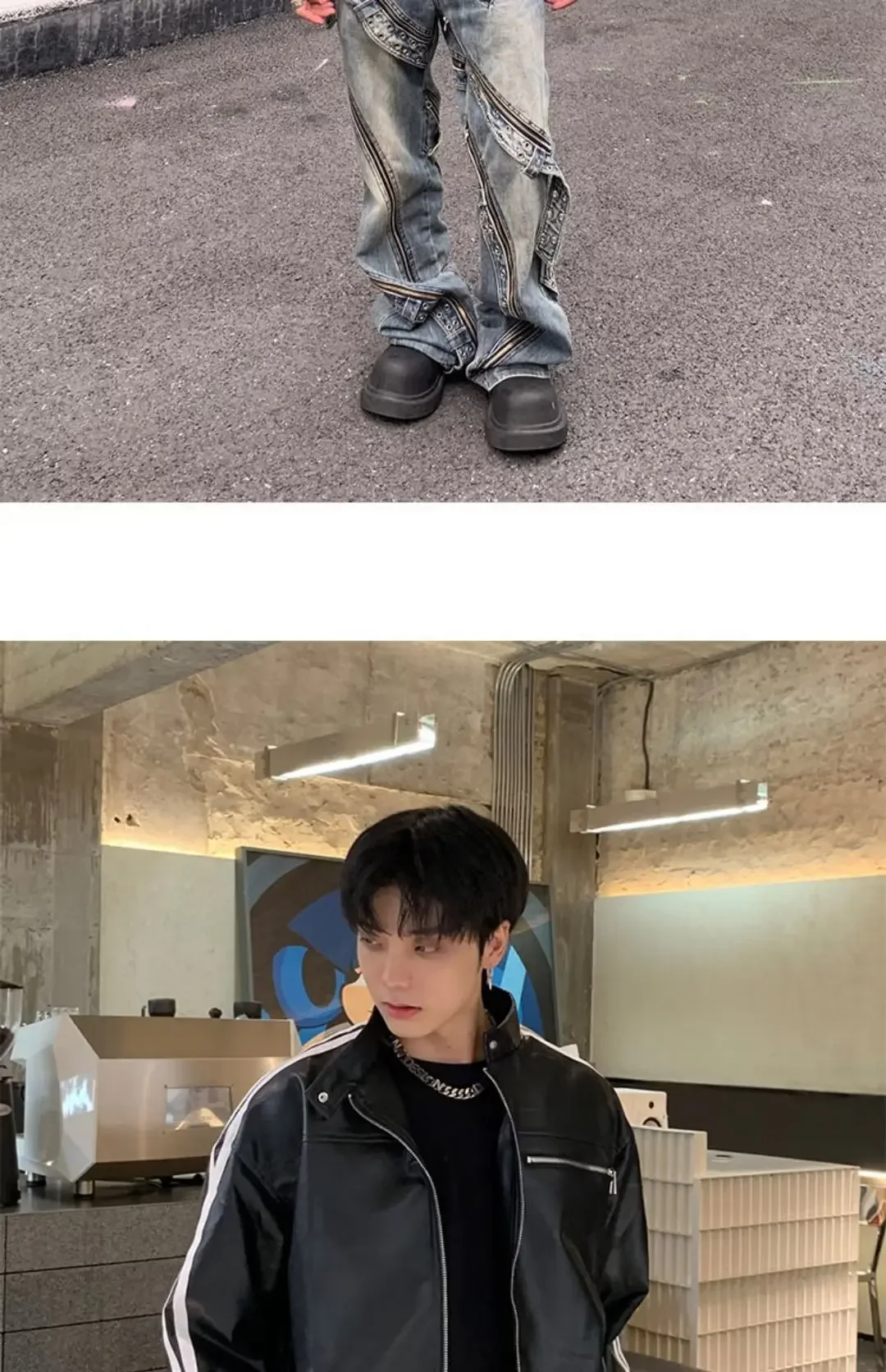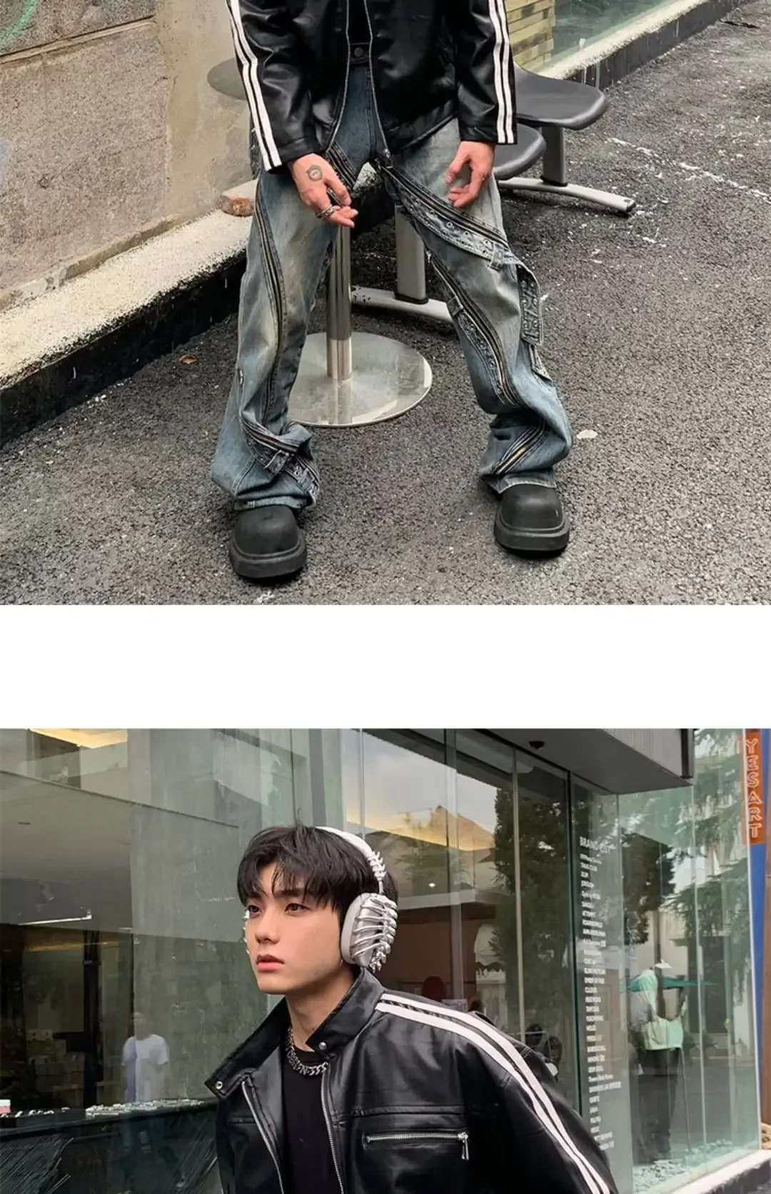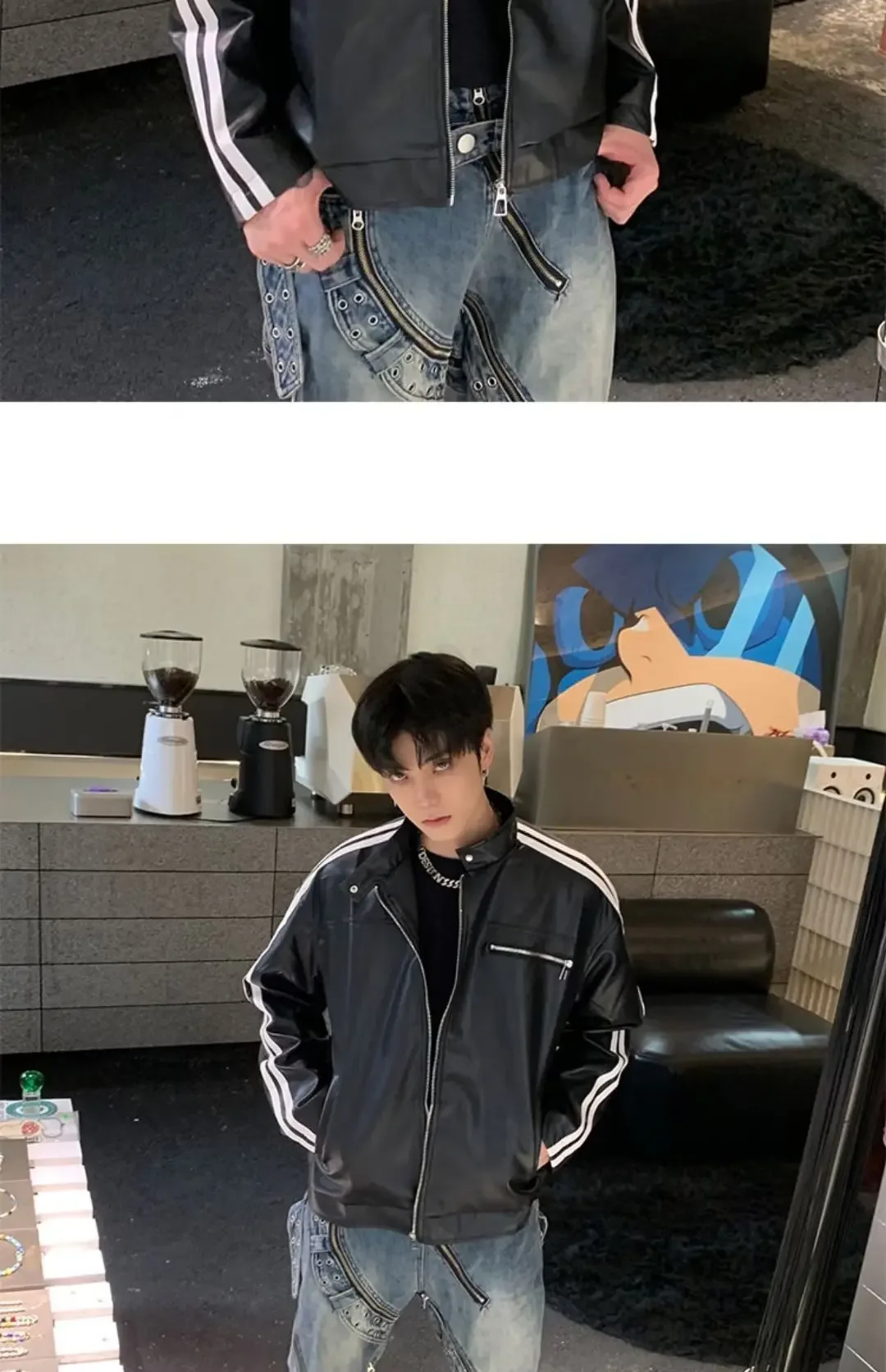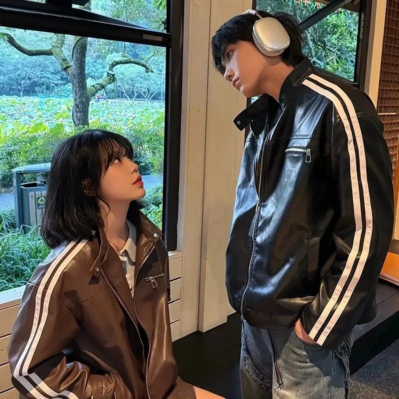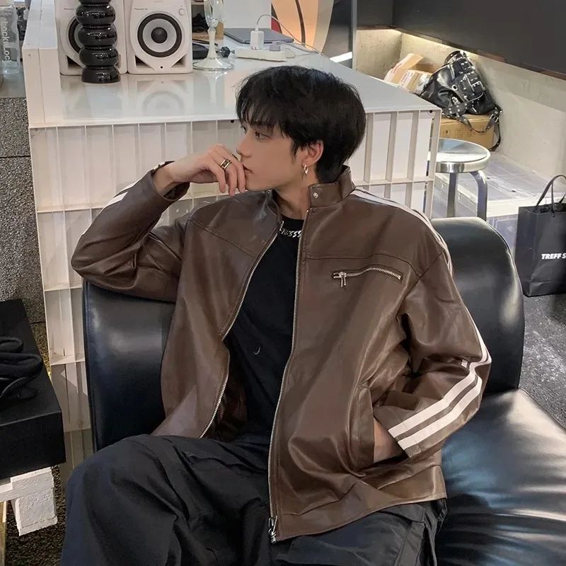 Retro Leather Jacket Men Women  American Patchwork Strip Racing Outerwear Loose Hip Hop Zippers Brown PU Coat Streetwear Spring