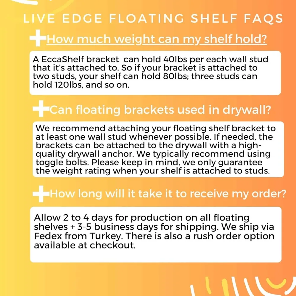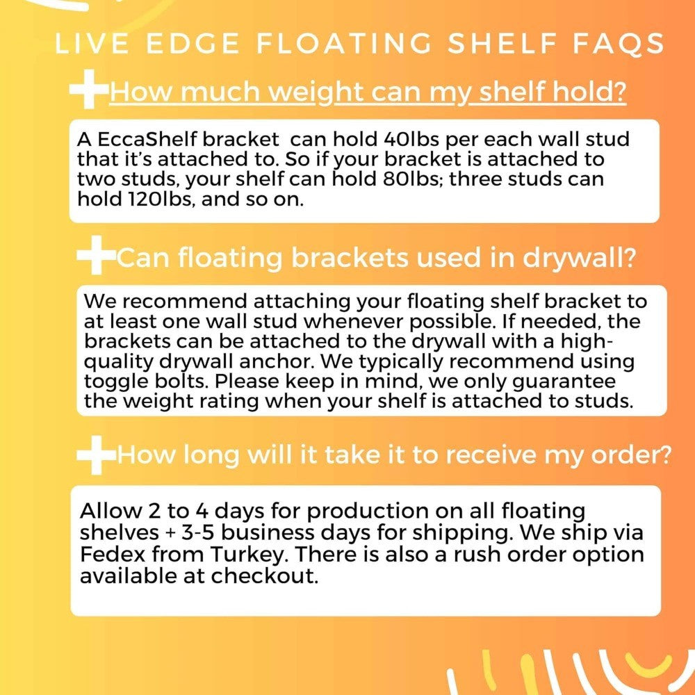 This product features genuine elegance with its live edge floating shelves designed for wall mounting. Crafted from real walnut wood, the natural edge is preserved, highlighting the wood's original shape and beauty, which imparts a rustic and organic aesthetic. These solid walnut shelves offer an aesthetic storage solution, appearing to "float" on the wall without visible supports, thus enhancing the overall look. Known for their rich color and grain, these live edge shelves are a timeless design choice. The floating design of these shelves creates an illusion of added space, making rooms feel more open and airy with a modern touch. They are easy to install and can serve as a focal point above a fireplace, adding warmth and character to any room. Each of these handmade floating live edge shelves is unique, with slight variations due to the handmade nature and process. The actual wood may differ slightly from photos, with grains and colors appearing different due to natural wood variations and monitor resolutions. We are also open to creating custom wood floating shelves to meet your specific needs. If you desire something different, please reach out to us. With your purchase, you will receive a live edge walnut shelf, installation bracket, and screws. To ensure a smooth and quick installation process, you will need a tape measure, stud finder, pencil, level, and drill.