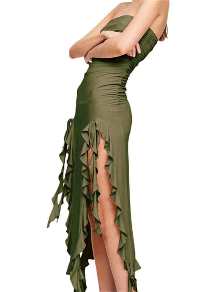 Sexy Strapless Off Shoulder Midi Dress Women Ruffles Split Beach Dress 2025 Summ