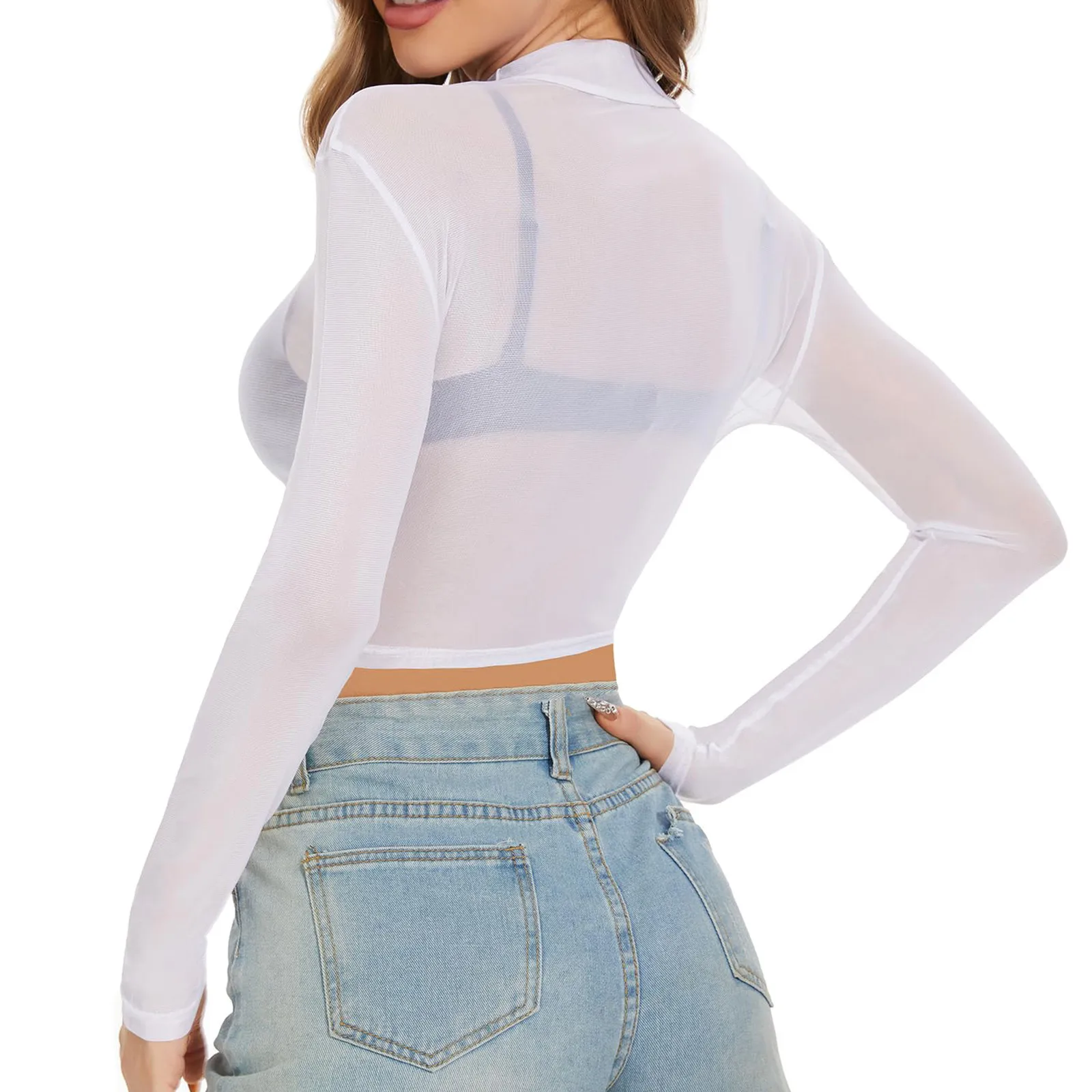 Sexy Women Crop Top See Through Mesh Tops Long Sleeve Sheer Slim Fit T Shirts Ladies Stretchy Transparent Bottomed Blouses