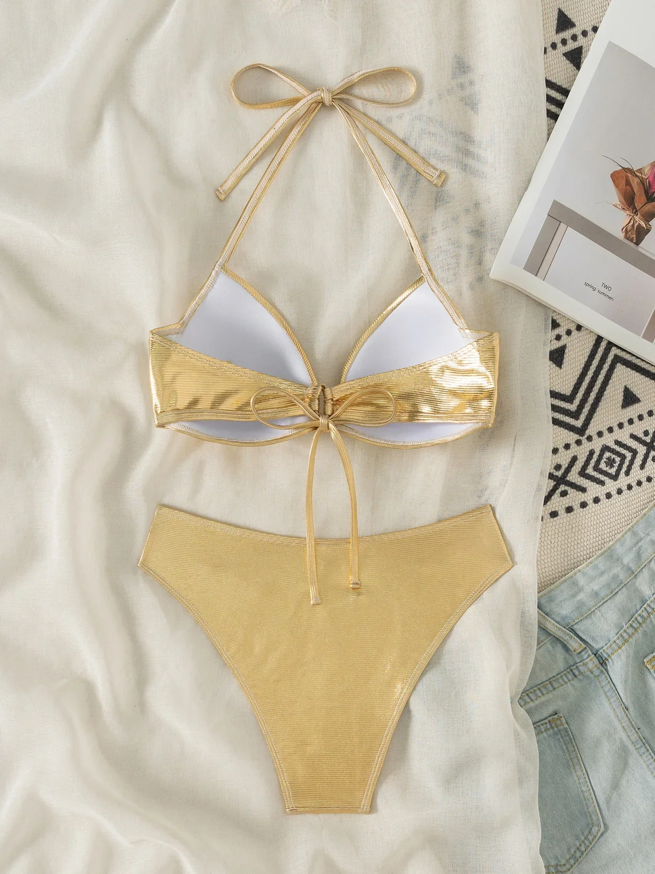 Shiny Gold Bikinis Sets Women Sexy Push Up Cross Bra High Waist Swimsuit 2025 Summer Bathing Suit Holiday Two Piece Swimwear